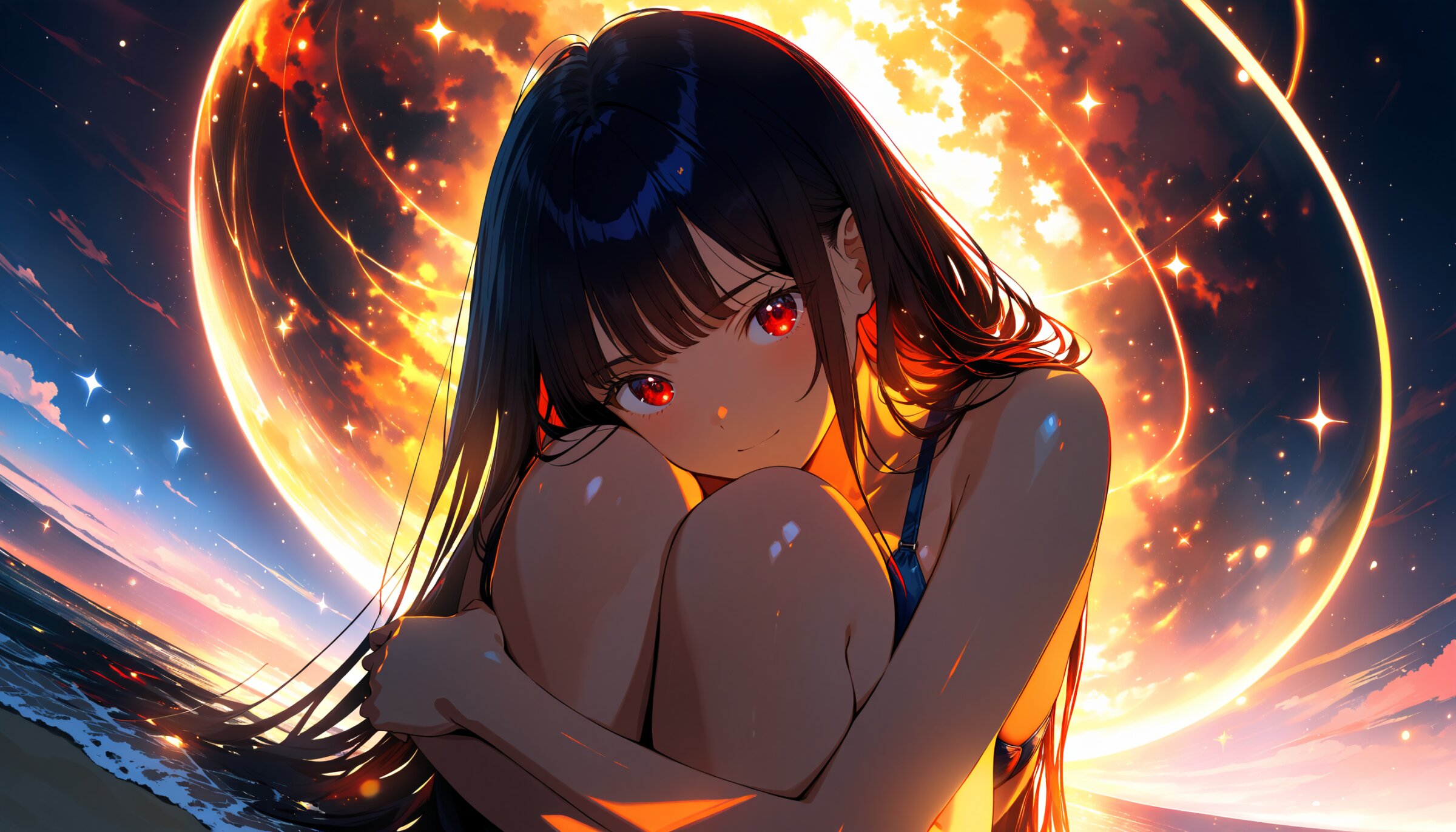 (((masterpiece,best quality,amazing quality,very aesthetic,high resolution,ultra-detailed,))),(CG,illustration),1 lady,a beautiful and japanese lady,26 yo,tall stature,silky hair,wispy bangs,low-tied long hair,burgundy hair,shiny skin,detailed skin texture,fair skin,lovely skin,beautiful face,energetic and cute face,natural eyebrows,long eyelashes,detailed eyes,double eyelid,big round anime eyes,sensual style,crimson red eyes,(face focus:0.7),soft cheeks,light smile,hugging own legs,mega breasts,glamorous,BREAK,deep blue off shoulder bikini,sandal,BREAK,highly detailed background,beach,seaside,starry sky,(top light,nature light,cinematic lighting,deep shadows),full body,side view,10000