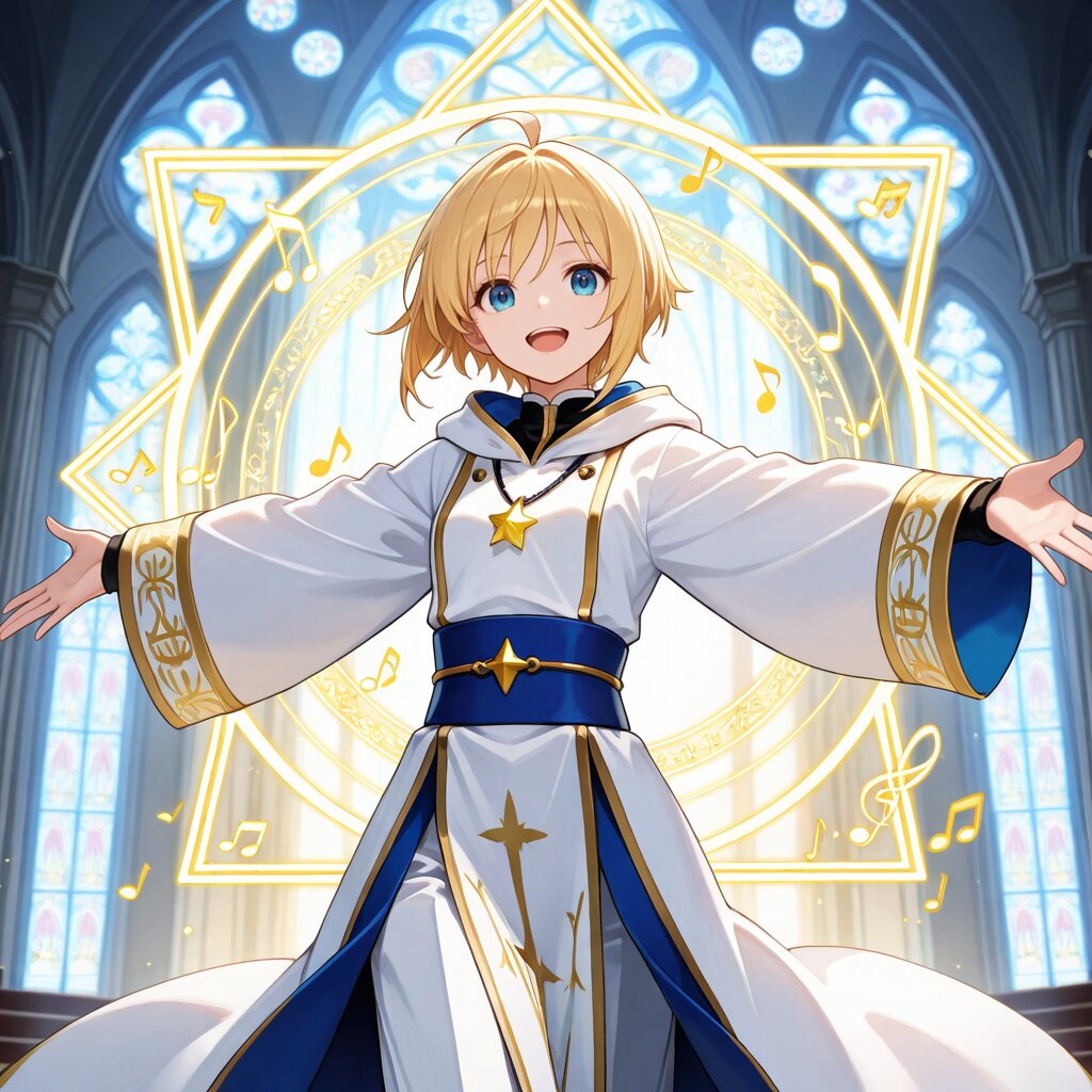 masterpiece,best quality,highres,highly detailed,general,(so many huge musical note,so many glowing musical note background,flying so many glowing musical note,glowing golden magic circle,Open mouth wide,spread arms),from front BREAK 1girl,solo,17 years old,cute girl,slender,small breasts,Very long sleeves that cover the wrists,light smile,(blonde hair, short hair, ahoge, blue eyes),priestess,white clothes,(long white robe, long white tabard, long white pants, hood down, Star pendant),obi,boots,slender girl,upper body,looking at viewer,standing,Girls singing,stained glass,church,fantasy,