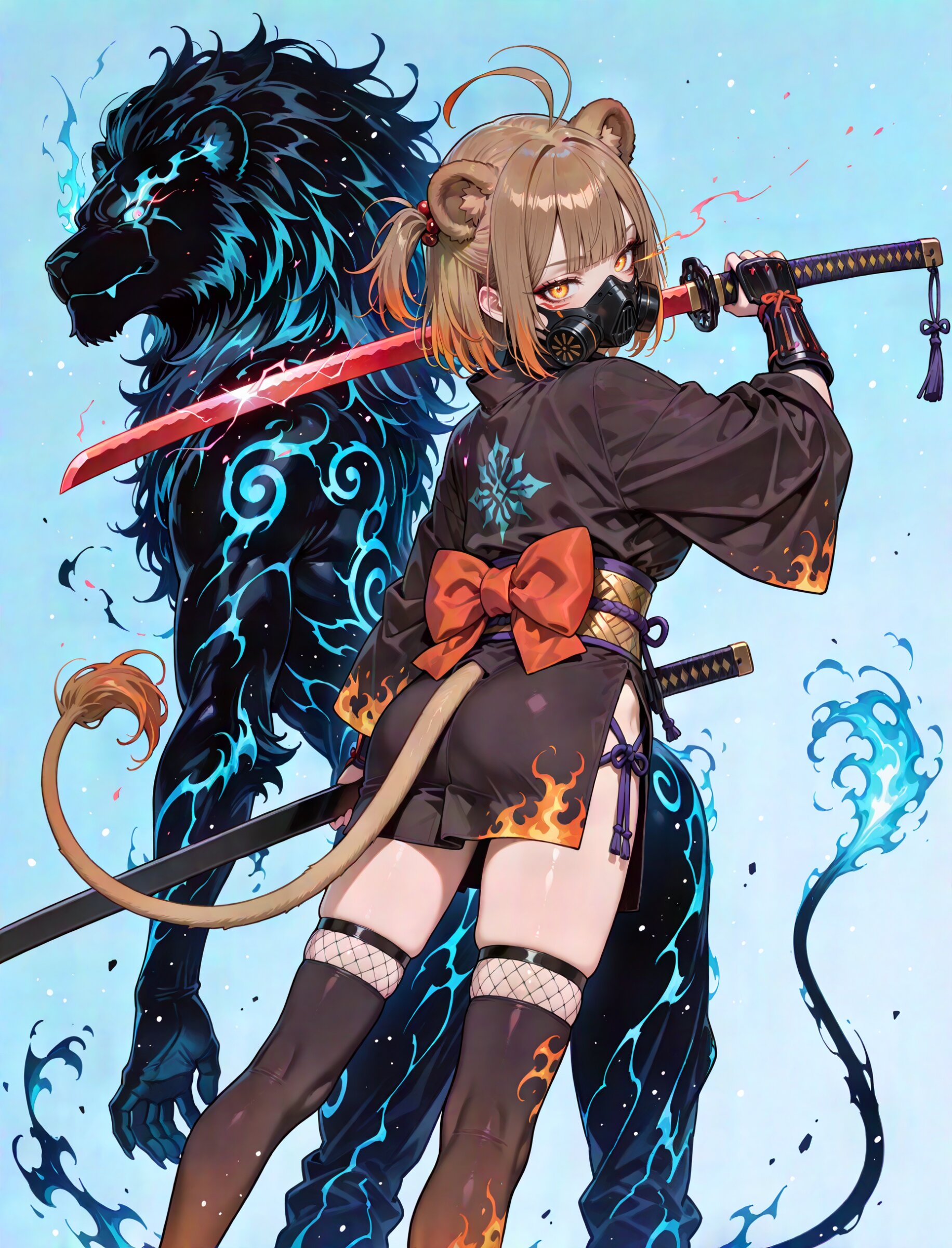 super fine concept art, hard surface, 8K, masterpiece, best quality, amazing quality, very aesthetic, absurdres, from behind, looking another, feet out of frame from below, looking down looking at viewer, (dutch angle:1.2), The silhouette is composed of dynamic, horizontal-striped and vibrant octahedron. The background is a solid, creating a striking contrast with the intricate, multi-colored design of the character, summer atmosphere. glowing lion energy, pale blue silhouette of serious lion guardian, huge lion aura, 1girl, samurai, (muscular female:0.65), bronze hair, light blue colored tips, chest length hair, one side up center-flap bangs antenna hair , flaming eye, eye trail, beautiful burnt sienna eyes beautiful breasts, ,, ninja cloth, short kimono, obijime, fishnet inner, fishnets, fishnet thighhighs, ninja pants,, kote, (ninjutsu:1.1), (holding ninja sword:1.1) mask around neck, respirator, , revealing clothes, zouri, ninja pants, lion ears, lion tail, facial mark, japanese clothes, seductive smile, dynamic pose, kung fu attack, kung fu action, kuji-in, ninjutsu, multiple weapons , raijin, lightning (swirling ink effects:1.2) blocking, beautiful metallic luster, sharp katana, ultra detailed katana, silver particles, light trail, The background is a solid, bright pale blue, creating a striking contrast with the intricate, multi-colored design of the character, (dancing silhouette:1.0), pop color background, (high saturation:1.2), summer coloring, partly black ink wash effect, pale blue drop shadow, professional art lots of details, , overexposure, sumie effect style, 4ur4_illu,shiny, glowing, glowing particles, glowing light particles, light particles, pale blue crystal, <lora:noline (1):-0.5> <lora:sdxl2-flat2-512b:0.0> <lora:facelightup_xl_v10:0.5> <lora:V2_yakumo_alchemy:0.5> <lora:Aura_illu:0.1>