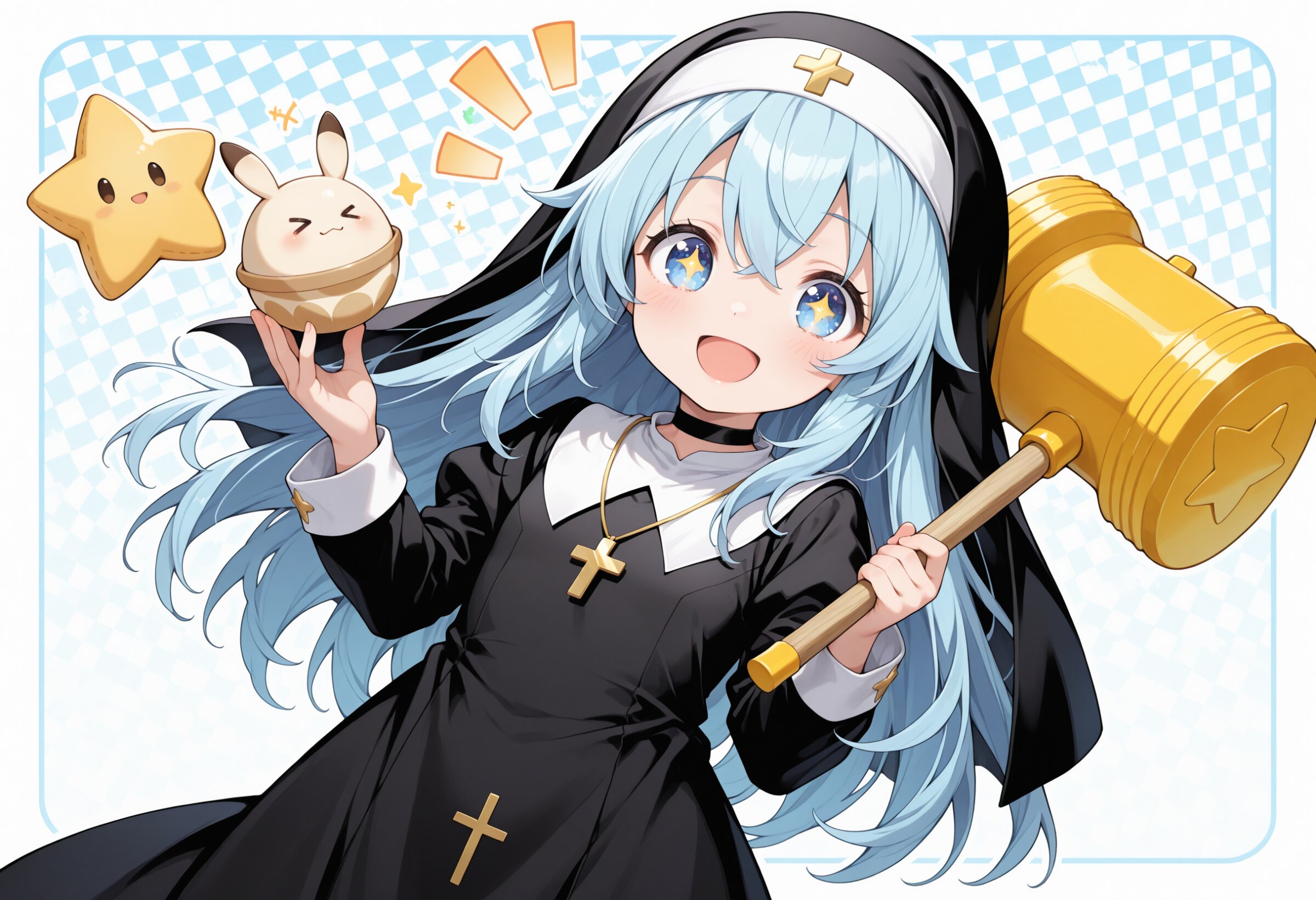 1 little girl, 10yo, solo, diagonal angle, masterpiece, best quality, amazing quality, very aesthetic, sky blue hair, long hair, blue eyes, + +, open mouth, smile, cheerful, +++, notice lines, choker, nun outfit, holding plastic toy hammer, yellow star sticker on hammer, humpty dumpty, > <, checkered background,