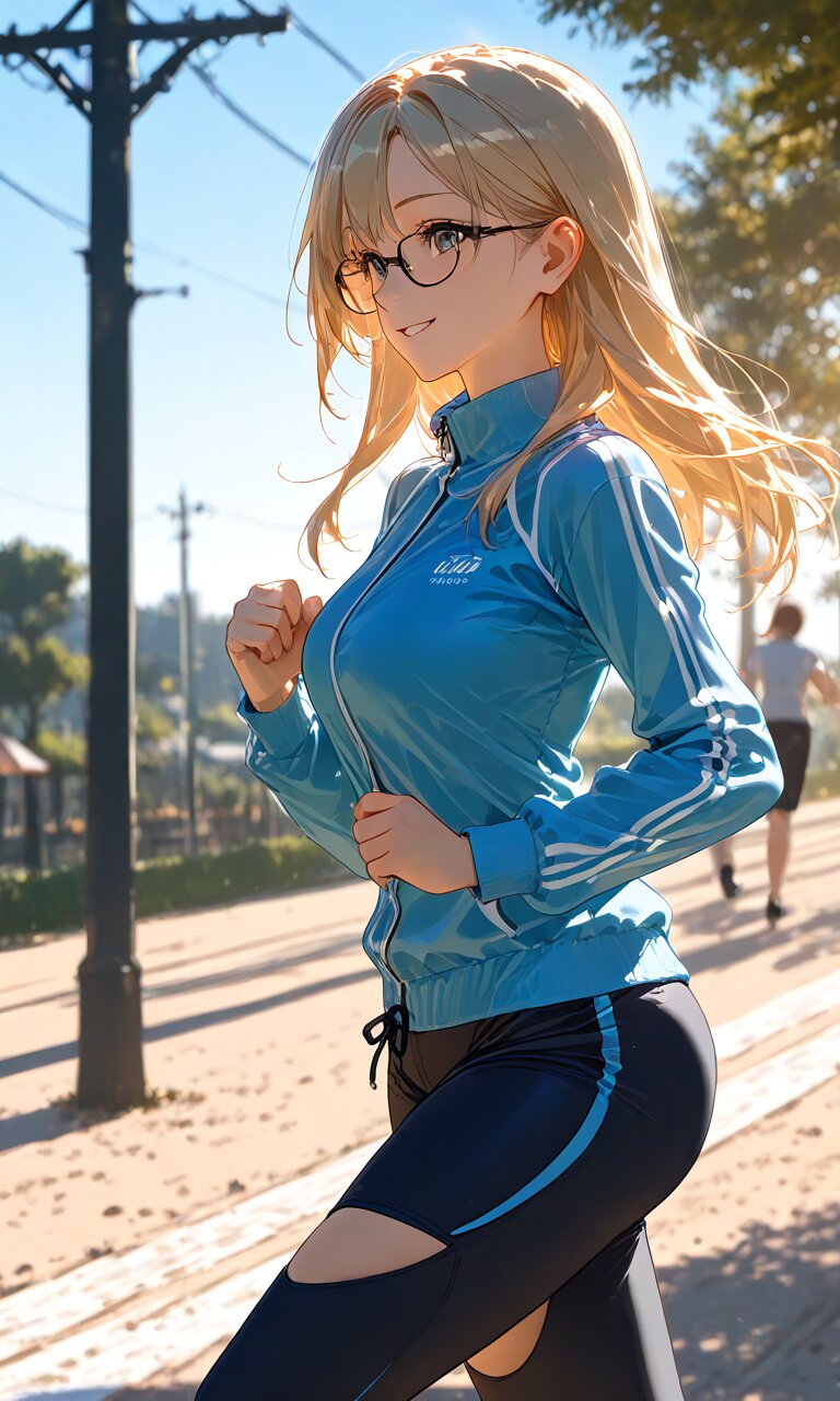 1 lady, long hair, blonde hair, glasses, smile, jogging, (side view) morning,