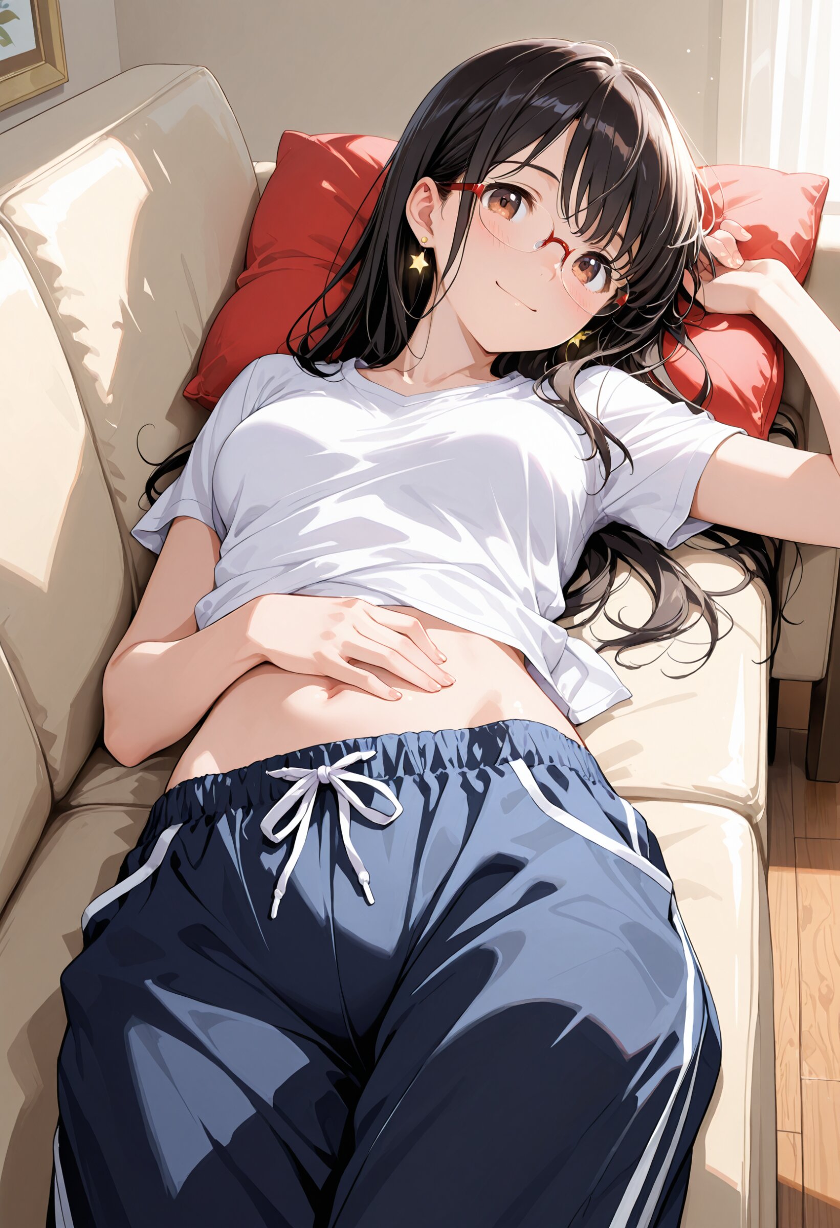 pale pastel colors, 1girl, 17 years old, 155cm tall, brown eyes are shining and cute, black hair, long hair, extremely detailed neat hair,Straight hair, tareme, ((red semi-rimless eyewear:1.2)), star earrings, medium breasts, smile, blushful, happy, compassion, lounging on a couch in a relaxed pose. wearing a comfortable, plain t-shirt and pajama pants that are partially pulled down, revealing a glimpse of underwear. reclined against the back of the couch, with one arm casually draped over the side and the other resting on their stomach. legs are bent, and their feet are propped up on the armrest. The couch is upholstered in a soft, textured fabric, and there are a few throw pillows scattered around. The lighting is warm and inviting, casting soft shadows across the scene. The background is slightly out of focus, suggesting a cozy living room setting, cinematic lighting, masterpiece, best quality, ultra-detailed, 4k, 8k, finely detailed, highres, anime, intricate, soft lighting, sharp focus, beautiful