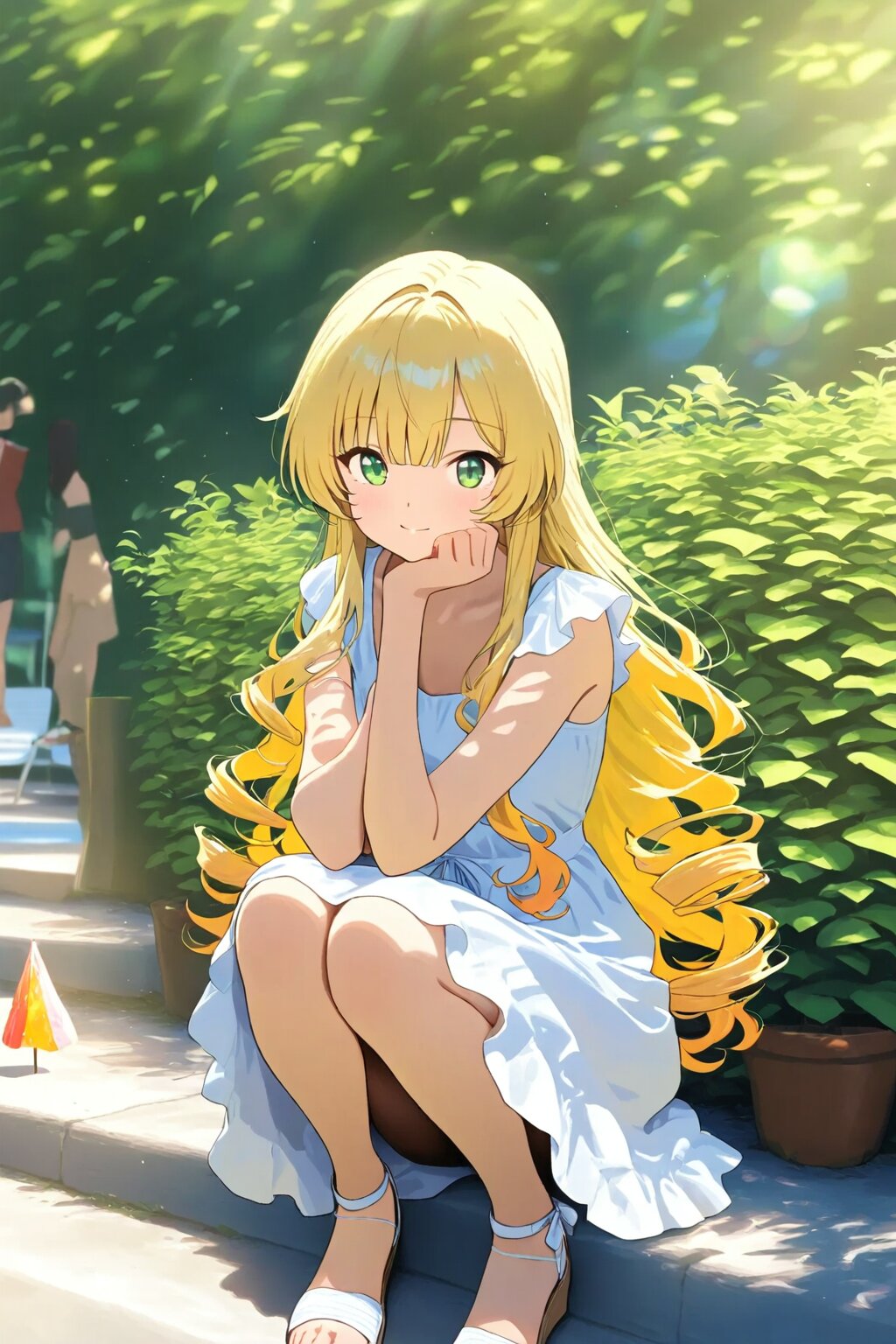 1 lady, long hair, (blonde hair), spiral curls, dress, summer, outdoor, party