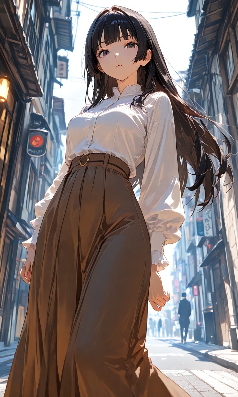 (best quality),(masterpiece),(ultra detailed),1 lady, long hair, black hair, blunt bangs, brown skirt, long skirt, white blouse, street, from below