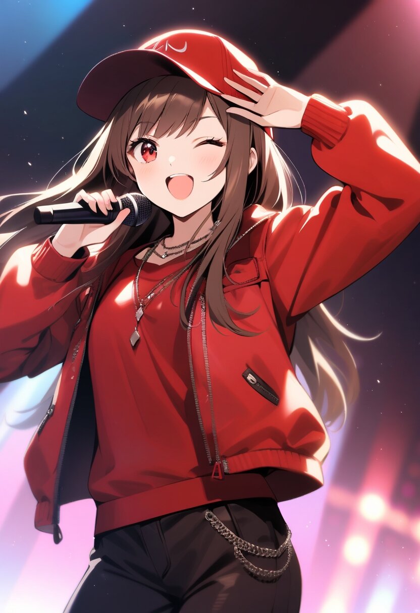 detailed, dutch angle, 1girl, solo, 15years old, looking at viewer, long hair, bangs, brown hair, red eyes, red-baseball cap, jewelry, necklace, deep red headwear, baseball cap, open jacket, long sleeves, red (down jacket), red long shirt, black cargo pants, black sneakers, neckstrap, right arm up, ((holding microphone, singing)), open mouth, one eye closed, sweet, ((cowboy shot, from front)), nightclub,