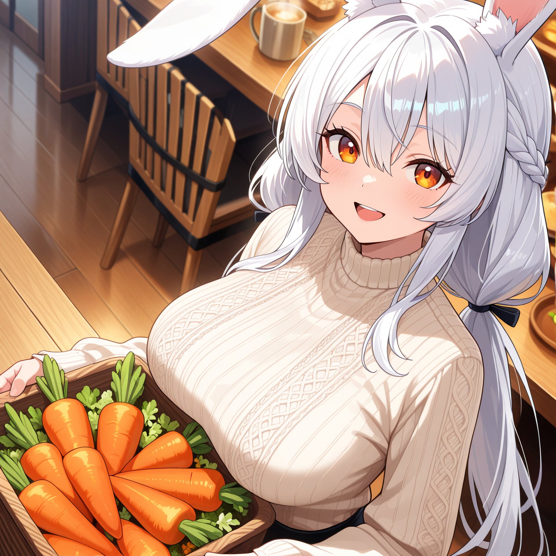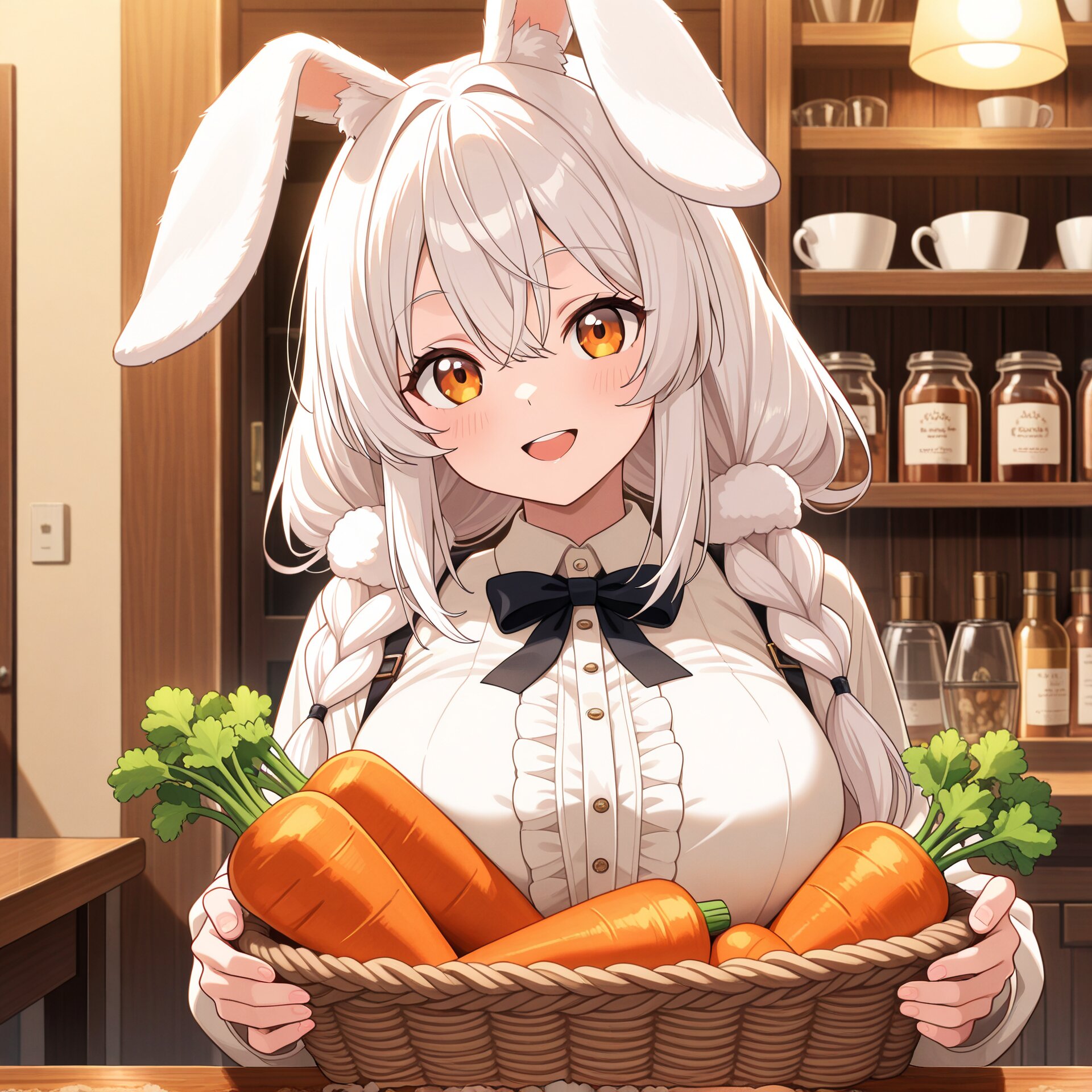 masterpiece, best quality, ultra-detailed, intricate details, highly detailed face,anime style, 8k illustration, 1girl, white fluffy rabbit ears, white hair, low twintails, braid, wavy twintails, long hair, airy bangs, long side bangs framing the face, strands of hair between eyes, amber eyes, large breasts, open mouth, holding a freshly harvested carrot with both hands in front of her body, presenting it proudly, warm indoor cafe-like background, wooden tables, cozy light, fresh vegetables in baskets, welcoming atmosphere, bright cheerful smile, natural and wholesome mood, cute rabbit girl