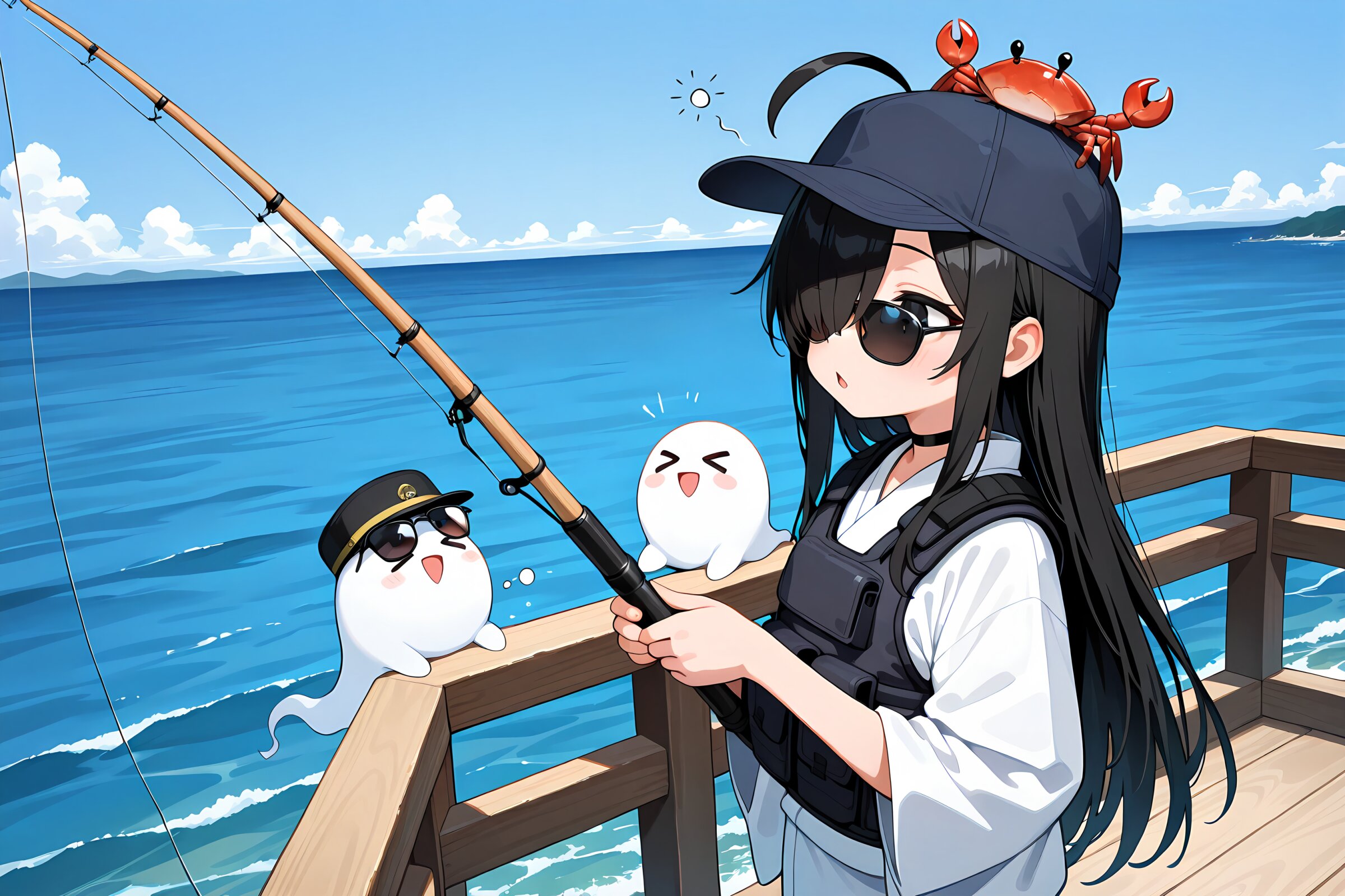1 little girl, solo, diagonal angle, from side, masterpiece, best quality, amazing quality, very aesthetic, black hair, long hair, ahoge, (hair over one eye:1.2), black eyes, chestnut mouth, smile, mouth, cheerful, relaxing, squeans, spoken squeans, (ghost:1.2), > <, choker, white kimono, utility vest, sunglasses, cap, standing, fishing, crab on head, breakwater, ocean,