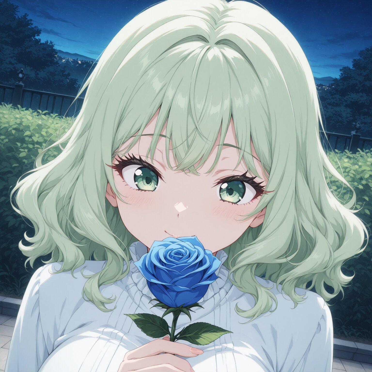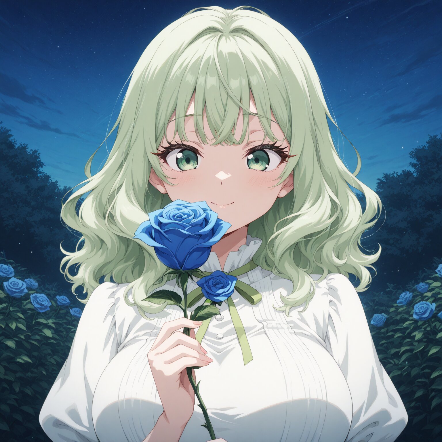 (1girl), (choppy bangs:1.2), ((green hair:1.2)), ((Wavy hair:1.3)), very medium hair, soft hair, gentle face, big breasts, yellow green hair BREAK, ((light green eyes)), round eyes, ((kind face)), ((long eyelashes)), (Blue Rose: 1.2) A single rose, holding a rose, smelling it Prince, princely clothes, dignified, garden, night BREAK, ((newest, year 2024, anime, animation, anime screen capture, anime style:1.3)) BREAK, ((masterpiece, , vibrant, very aesthetic, highly detailed, best quality, 16k:1.3)) Perfect hands, perfect fingers,