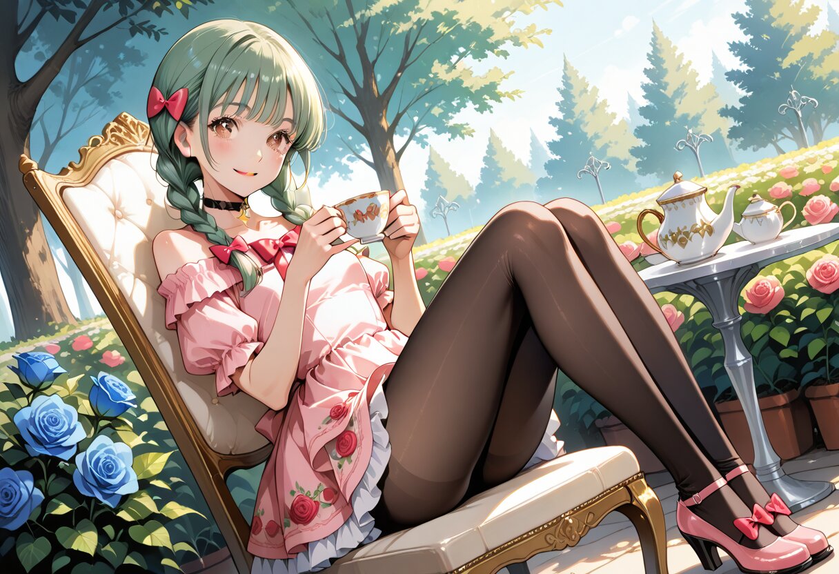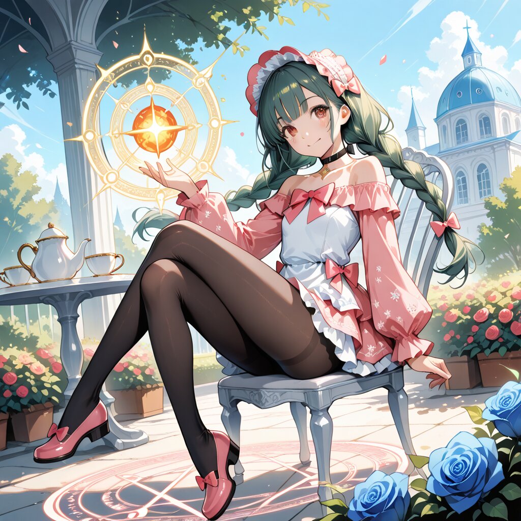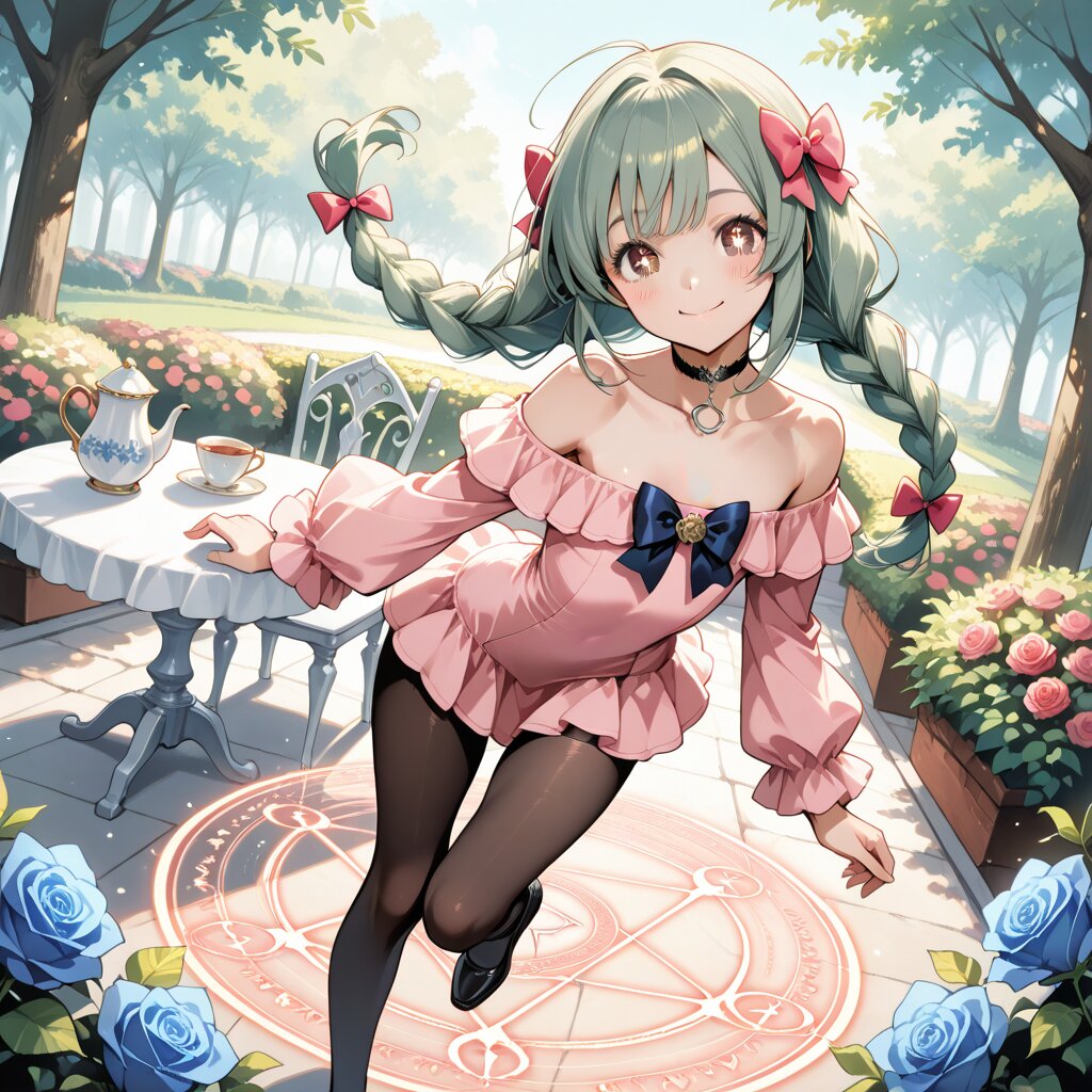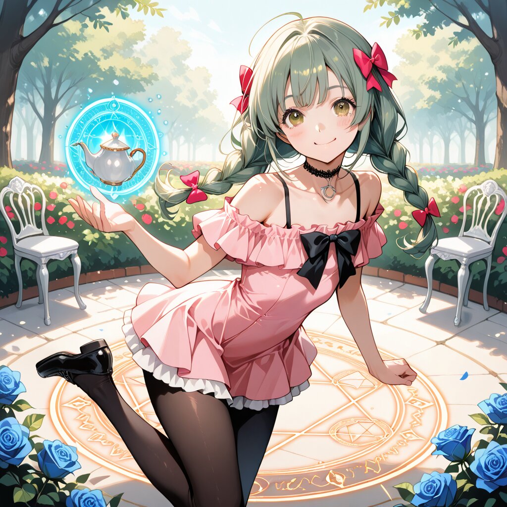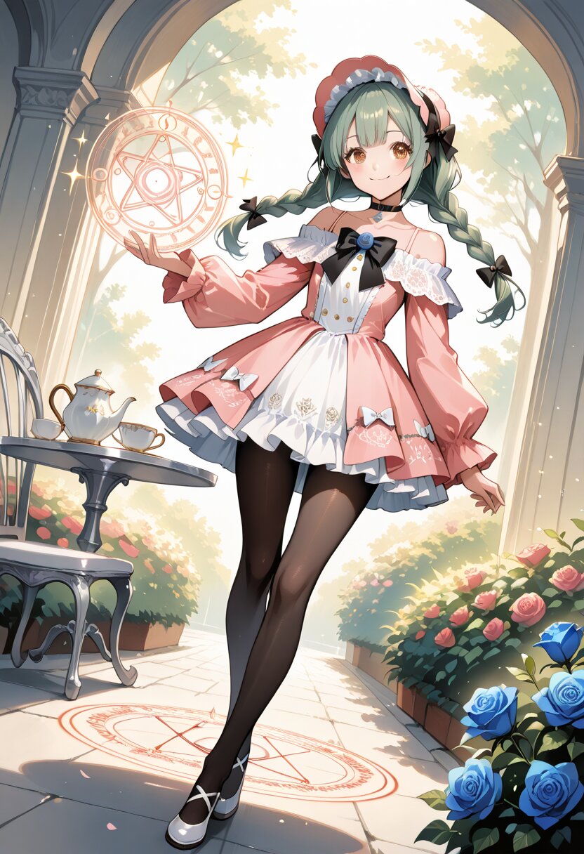 (rating: sensitive:1.2), score_9, score_8_up, score_7_up, score_6_up, source_anime, (in pastel color style, delicate illustration), (delicate illustration), (super dynamic angle from side), diagonal view. (Large magic circle, Magic activation:1.3). casting an explosion spell with magical effects, in a dynamic pose and angle, 1girl, holding a blue rose, lovely, beautiful, attractive, intelligent, curious woman (green hair in two braids (bows), long fringe, glossy, big beautiful light brown eyes (droopy, sparkling eyes), smile, blush, flower decoration, silver decoration with “m's” on neck choker). pretty one-piece dress (pale pink clothes, off-shoulder, vermilion embroidery), cartoonishly beautiful face, lolita fashion, lolita dress, bows, (mini skirt, black tights), shoes. and a wolves:1.5, fenrir, BREAK background (rose garden, full of blue roses:1.2), outdoor, white table, white chair, teapot, tea time, day. (cheerful illustration, fantasy, ultra-intricate detailed), flat design, bold colors, patterned fabric, beautiful composition. BREAK insanely beautiful and detailed clothes, extremely shiny hair, beautiful small face, long eyelashes, double eyelids, closed mouth, smile, kawaii, cute, flat chest, slender, {exquisitely delicate skin}, perfect anatomy, perfect fingers, dynamic angle, dynamic pose, BREAK perfect AI rendering, three-quarter view, realistic background, BREAK (masterpiece, aesthetic quality, 8K, ultra-detailed), (perfect design, realistic complex), absurdres, highres, hyperrealistic, photorealistic, soft lighting,