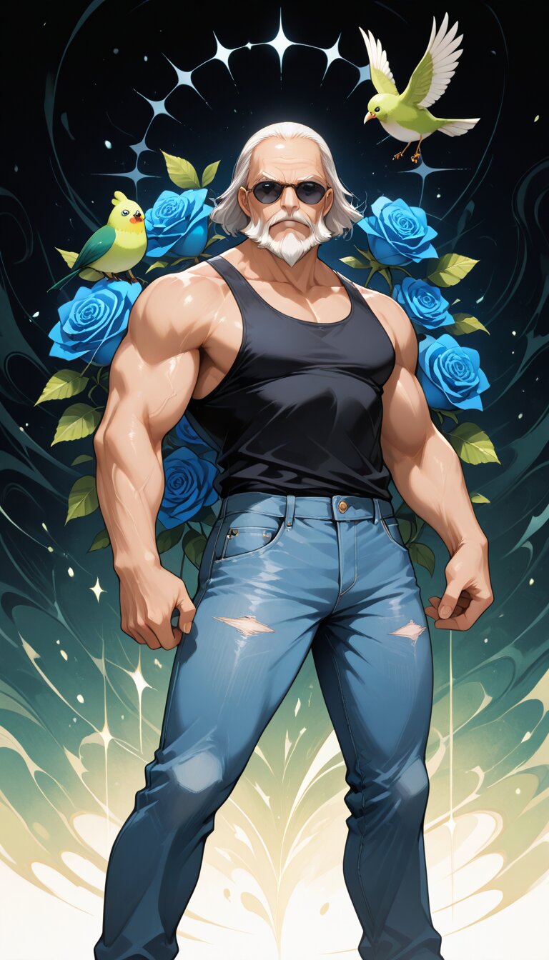 Solo, muscular, old man, beard, sunglasses, powerful performance, serious expression, dynamic pose, tank top, jeans, Holding blue rose,(abstract background, blue rose), BREAK round green bird, a marimo, a creature with shining whiskers, bird-like legs, a beak, white eyes,