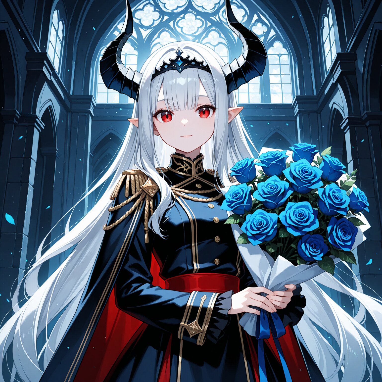 masterpiece,best quality,highres,highly detailed,detailed eyes,highlight eyes,general,1girl,solo,17yo,(holding large blue rose bouquet,blue flower,black dragon horns,black horns,silver hair, very long hair,bangs, red eyes:1.2),cute girl,slender,Very long sleeves that cover wrists,medium breasts,dragon girl,dragon ears,pointy ears,light smile,closed mouth,(loyal princess,tiara,very long high-necked black loyal princess dress,very long loyal princess dress skirt,very long loyal princess gown,very long loyal princess cape,very long black loyal pants),sash,boots,slender girl,in loyal castle,beautiful castle,looking at viewer,upper body,fantasy,