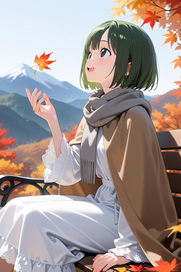 (masterpiece, best quality, great:1.2), (beautiful, insanely detailed:1.2), (distinct:1.2), (looking away, looking up), (cute), green hair, bob cut, black eyes, cute eyes, (gray scarf), brown cloak, white robe, white frilly skirt, autumn, autumn leaves, mountain, (falling autumn leaves), sitting, Bench、Raise one hand, open mouth, looks happy