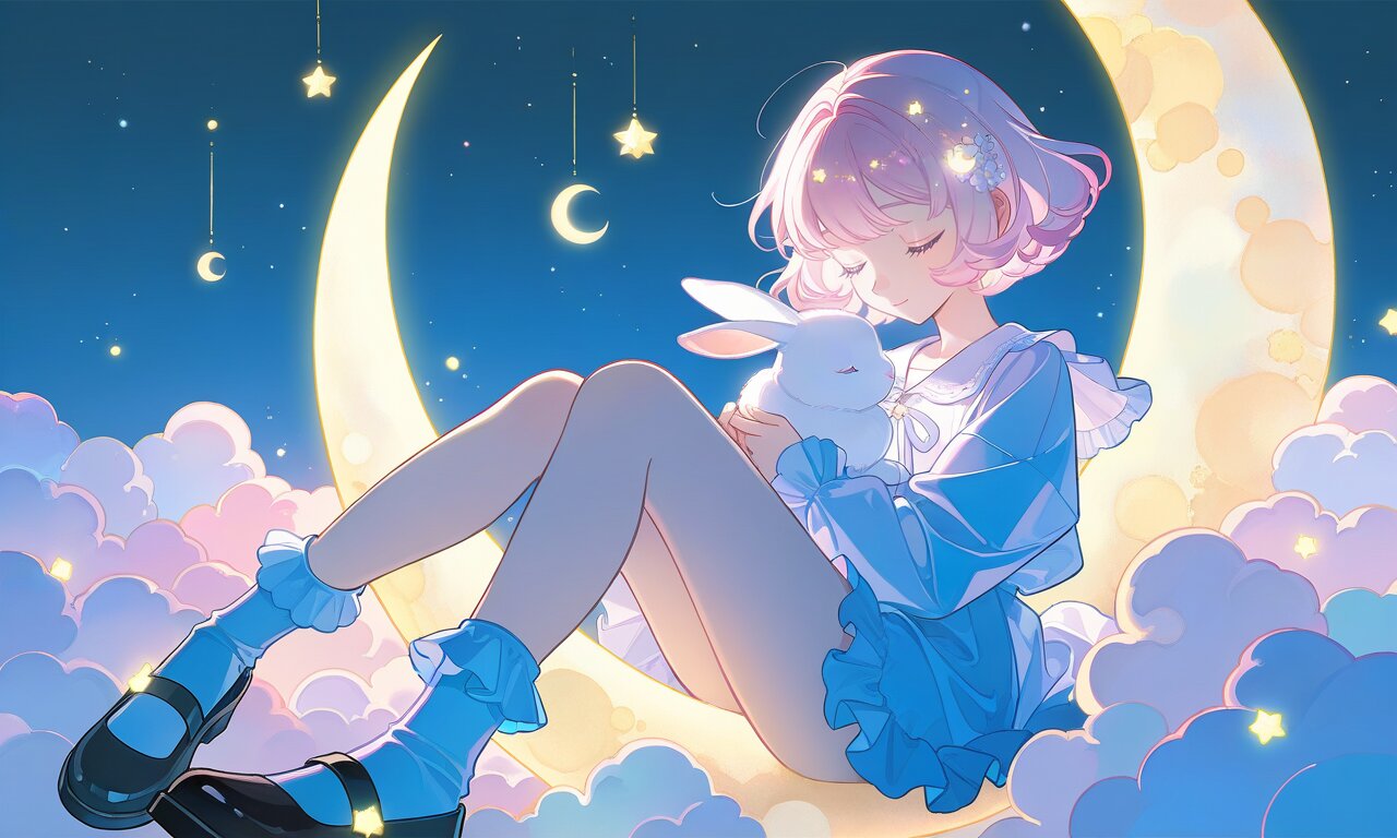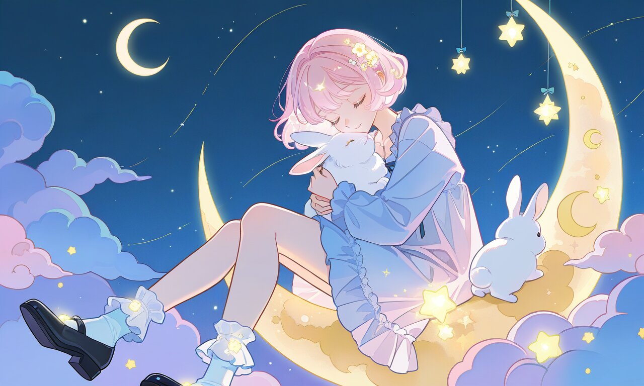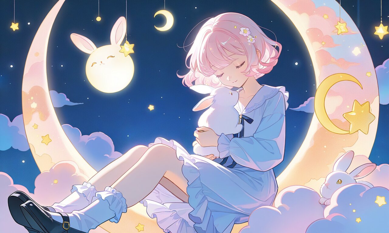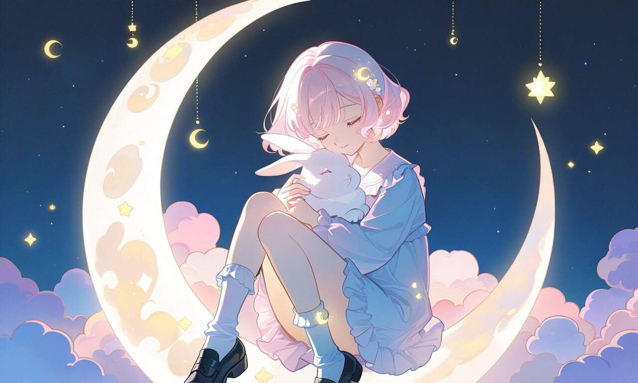 A dreamy anime illustration of a girl with light pink hair, loose wavy short bob cut hairstyle, wearing a delicate floral hair accessory. She is sitting on a crescent moon in the night sky, holding a cute white rabbit. She wears a loose nightgown decorated with moons and stars, frilly socks, and black shoes. Her eyes are closed gently, giving a peaceful and serene expression. The background is filled with glowing stars, small crescent moons, pastel clouds, and sparkling cosmic dust. Soft pastel colors, magical atmosphere, whimsical fantasy style, highly detailed, smooth shading, beautiful lighting, studio quality, ((masterpiece)), ((best quality)), (ultra-detailed), illustration, a cute girl, 1girl, solo,