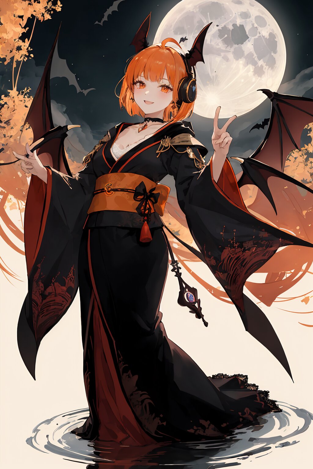 Anime style:1.05, full body:1.2, 8K Ultra HD:1.2, high detail:1.2, plain background:1.2, no watermark. A beautiful Japanese idol girl with orange bob haircut, no ahoge. She wears an elegant vampire idol costume:1.3 with black velvet and crimson satin:1.3, sheer lace sleeves:1.2, and a flowing cape with blood-red lining:1.3. Transparent chiffon accents:1.2 add elegance, with subtle bat-wing and star motifs. Signature orange headphones with monkey ears:1.5, redesigned in gothic style, decorated with crescent-moon and bat charms. Accessories: golden cross choker with red gem, crescent-moon earrings. Theme: the full moon:1.4 glowing behind, creating dramatic backlight:1.3 and ethereal rim-light around her silhouette. Lighting: cinematic studio mix of cold moonlight backlight and soft warm fill on her face, emphasizing velvet sheen and lace transparency. Pose: peace sign with one hand:1.3, other arm relaxed. Expression: radiant big smile:1.3 with a touch of vampire allure, slightly narrowed eyes:1.2. Composition: centered, balanced full-body, vertical perspective for a regal and haunting beauty.
