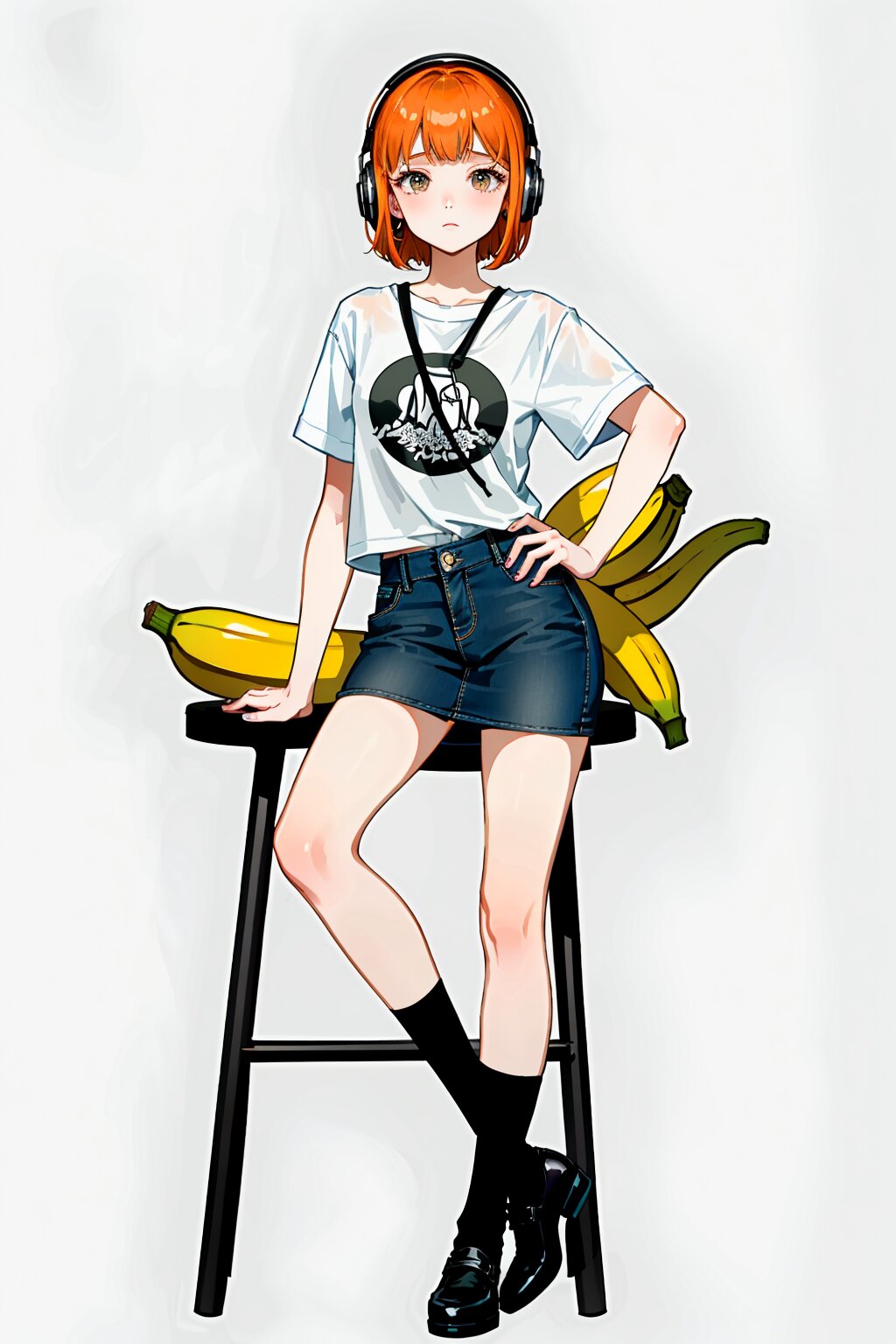 Main Subject (Zena): Japanese idol Zena:1.3 Orange bob haircut:1.4, sleek and softly styled Pastel orange headphones:1.2, casually hanging around her neck for a playful touch Wearing a white oversized T-shirt:1.4 with a childlike crayon-style drawing of a monkey and bananas:1.5 printed on the front (intentionally “badly drawn” like a kindergartener’s doodle, colorful, uneven lines) Mini skirt:1.3, dark denim or simple black, balancing the casual top with a chic bottom silhouette Expression: confident yet playful, as if she knows the T-shirt is silly but she owns it with style Pose & Composition (Pro Photographer’s View): Studio-like minimal background (light gray or plain white), keeping focus on the outfit Zena standing tall in the center, one hand on her hip, the other lightly tugging at the hem of the oversized T-shirt Slight tilt of the chin, confident gaze toward the camera — fashion magazine style Optional alternate shot: seated on a stool, legs crossed, showing off the T-shirt graphic clearly Lighting & Photography Style: High-fashion editorial style lighting:1.4 — soft but directional light highlighting the T-shirt graphic Subtle rim light accentuating her hair and the shirt’s silhouette Clean shadows, giving a crisp and stylish magazine aesthetic Lens style: 85mm portrait with shallow depth of field for professional clarity Atmosphere & Emotion: Juxtaposition of silly childish art (monkey + bananas doodle) with serious fashion photography Cool, confident, slightly ironic — turning “uncool” into chic A playful commentary on style: “It’s not about the print, it’s about how you wear it.” ✨ Keywords: “Japanese idol Zena:1.3, orange bob haircut:1.4, pastel orange headphones:1.2, oversized T-shirt with childlike monkey and banana doodle:1.5, mini skirt:1.3, high-fashion editorial photography:1.4, confident model pose, professional lighting, magazine aesthetic.”