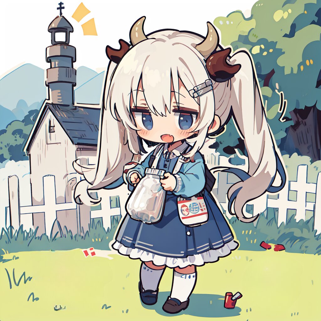 best quality, (empty eyes:-1.0), solo,1girl,(chibi:1.4),cow ears,twintails,:d,milk bottle,milk carton, outdoors,highland,ranch,cattle barn, <lora:fineline_v1:1.0>