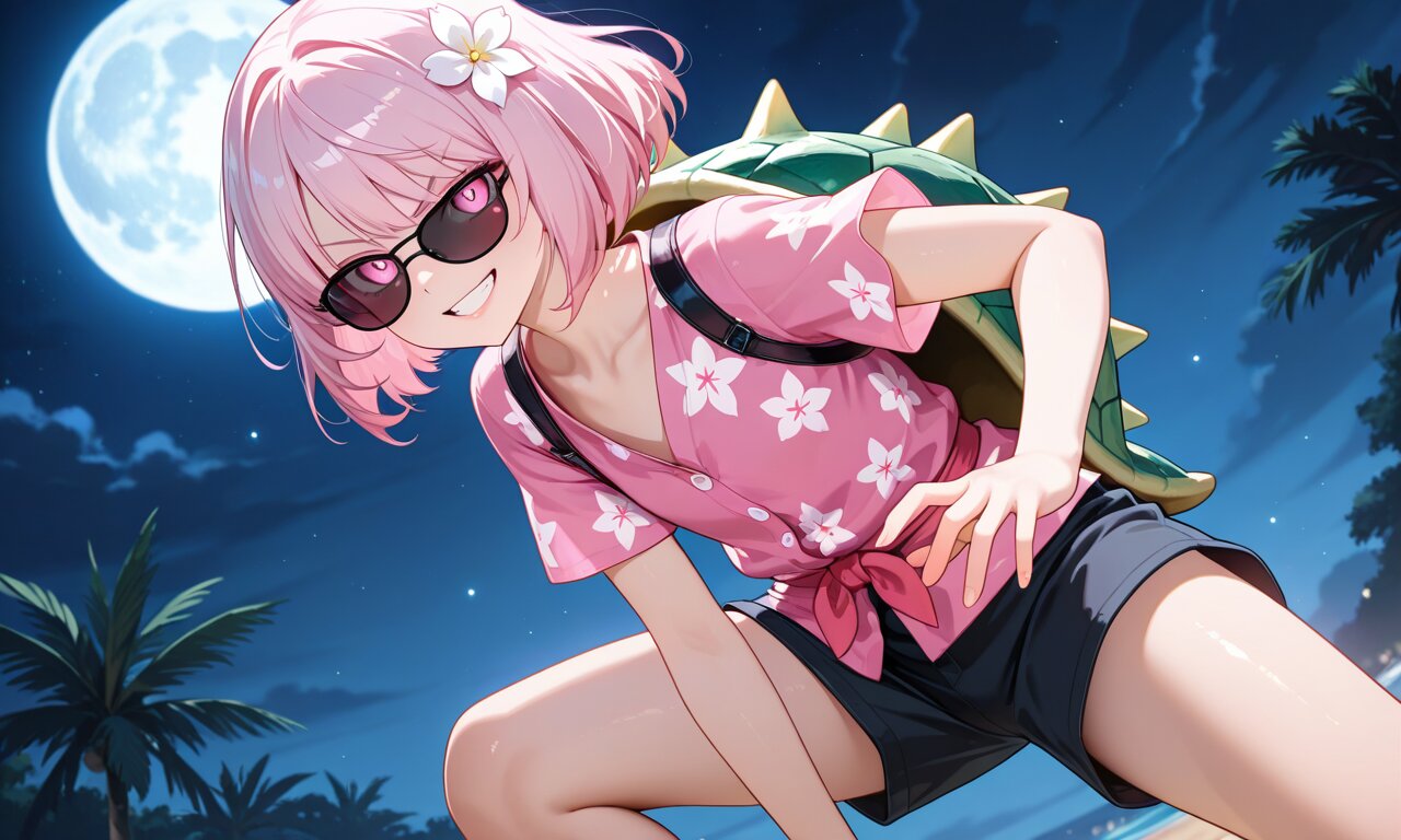 nice hands, perfect hands, perfect anatomy, perfect structure, sfw:1.2, (background is a large full moon in the night sky), (On a late night, midnight, the girl standing, gaze at viewer), outdoors, 1girl, solo, cowboy shot, dynamic angle, from the front, (She is wearing an aloha-shirt, Bermuda shorts, large turtle shell, sunglasses), superhero landing, ((Countless light particles floating around)), ultra detailed lips, ultra detailed face and hair, beautiful eyes, kawaii, adorable, cute, light pink hair,light pink eyes,loose wavy hairstyle,short bob cut,floral hair accessory,happy smile, (small chest, flat chest), open mouth grin, angry sharp eyes, covered front,, masterpiece, amazing quality, very aesthetic, high resolution, ultra-detailed, absolute, newest, 2d, semi-realistic, moe heroine, sharp focus,, anime style, anime color,