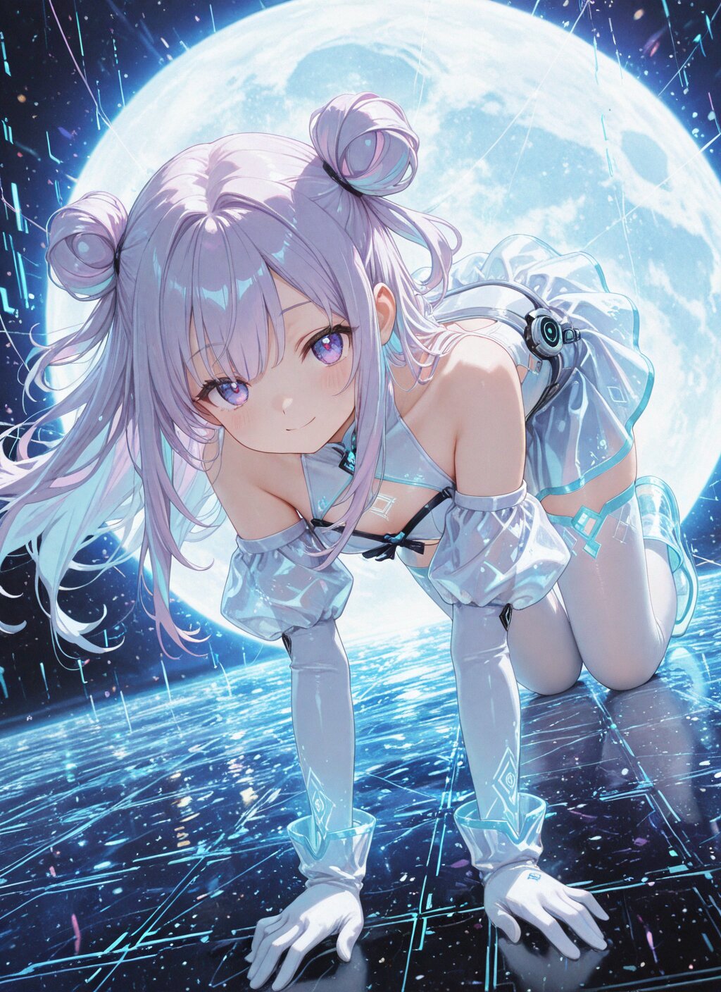 masterpiece、best quality、amazing quality, solo, kawaii, cute, dynamic pose, dynamic angle, looking at viewer, Pastel color palette, (Upper body: 0.9), soft cute girl with soft lavender hair and light blue inner highlights, long hair with two side buns and loose curls, one stray hair, large, bright purple eyes, a gentle smile, a faint glow, anime-style with emphasized contours, flat pastel-toned shading., futuristic idol outfit, elegant white one-piece dress, glowing cyan circuit-like lines, short flare skirt with glowing geometric patterns, sheer off-shoulder top, transparent puffy sleeves with glowing accents, high neckline with light-blue glowing trim, bodysuit-style underlayer with luminous seams, thigh-high stockings with glowing light rings near the top, transparent ankle boots with glowing soles, subtle holographic shimmer, luminous and refined design, pulsating light patterns
