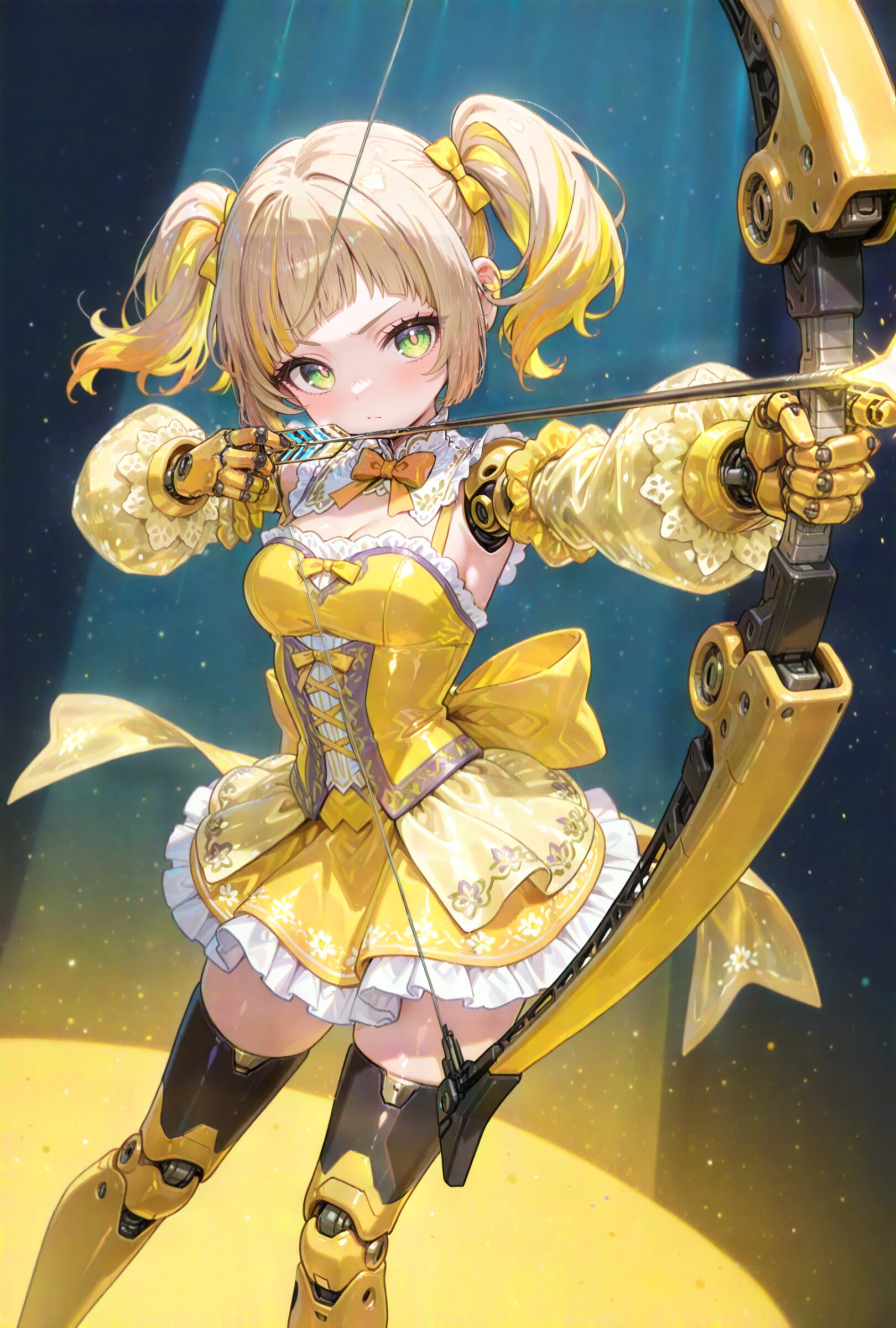 1girl, huge cool bow \(weapon\), drawing bow, arrow \(projectile\) in hands, holding huge cool weapon mechanism, machine, foreshortening, (25 years old:1.0), (medium breasts:1.2), (multicolored hair, darkmagenta,darkorange,blue,vanilla hair, chest length hair, twintails cut bangs , shiny and strong hair:1.0), (beautiful face:1.1), (clear buttercup yellow small eyes:1.0), green pupils , fighting stance, aiming, mechanical hands, mechanical legs, (cybernetic gynoid:1.0), (mech suit:1.0), (buttercup yellow gothic cuirass:1.0), (doll joints:1.0), (buttercup yellow gorgeous modest wizard's dress skirt:1.1), glossy metalic body with metallic luster cyborg, (Decorative embroidery:1.0), (buttercup yellow gorgeous dress:1.1), (overskirt:1.0), (buttercup yellow sleeve:1.2) masterpiece, best quality, amazing quality, very aesthetic, absurdres, you can add scenery, (volumetric lighting), To make the background more distinctive. professional art lots of details, , overexposure, shiny-glistening, (watercolor style:1.0), (pastel color style:1.0) <lora:noline (1):-0.5> <lora:sdxl2-flat2-512b:-1.0> <lora:facelightup_xl_v10:0.5>