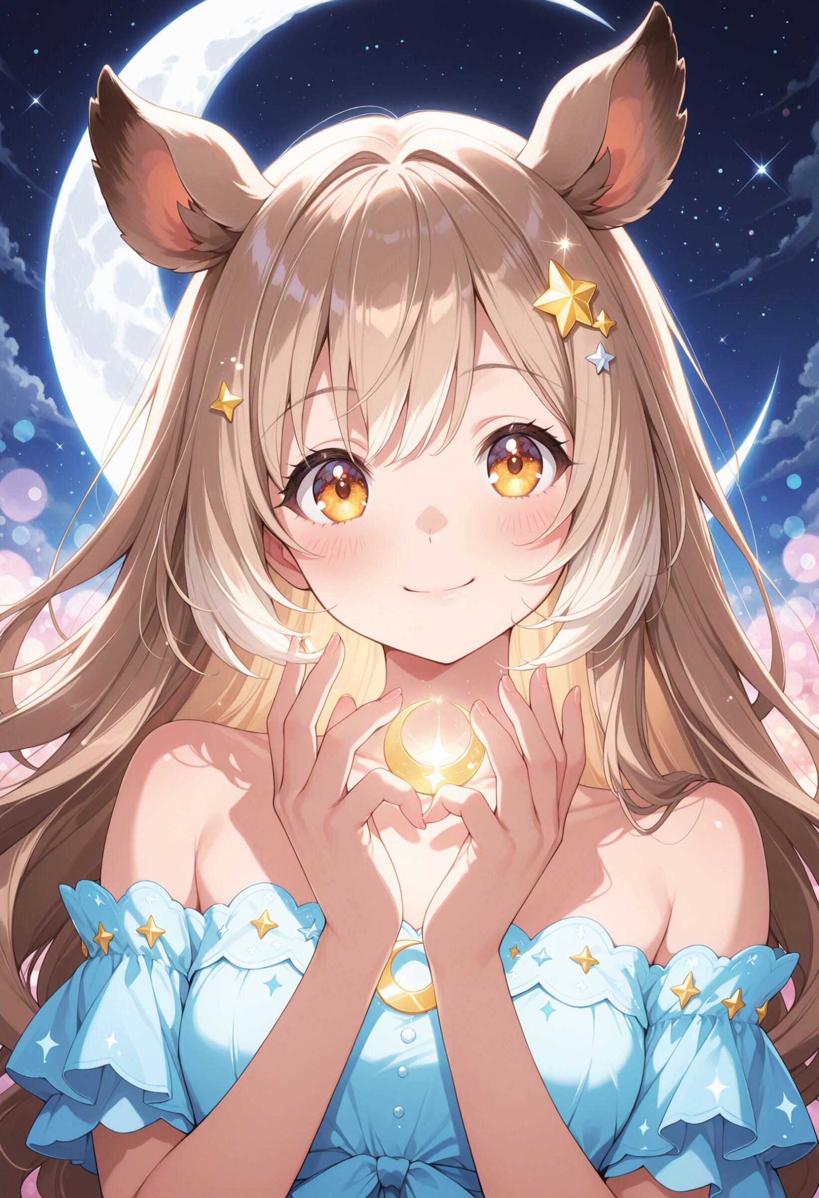 (masterpiece, best quality, ultra-detailed, intricate details, highly detailed face, anime style, 8k illustration), cute and charming style, soft lighting, dreamy atmosphere, 1girl, upper body, close-up portrait, face taking up most of the frame, big expressive amber eyes, long light brown hair with silky texture, fluffy wild boar ears, gentle smile, soft blush, adorable and endearing expression, moonlight softly illuminating her face, strands of hair glowing under silver light, eyes reflecting the glowing moon, magical sparkle in gaze, outfit: cute soft pastel-colored dress with subtle star and moon patterns, delicate ribbon accents, slightly off-shoulder for a dreamy look, background: glowing full moon, dreamy night sky with twinkling stars, soft bokeh effect, magical and celestial atmosphere, composition: tilted head, hair framing her cheeks, hands gently near her chest or holding a glowing small crescent moon ornament, kawaii aesthetic, soft glowing highlights on hair and skin, pastel tones, warm and comforting feeling