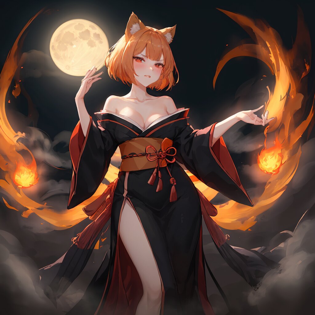 Main Subject (Zena): Japanese idol Zena:1.3, with vivid orange bob haircut:1.4, glowing seductively in the moonlight. Theme & Style: Mysterious bakeneko (化け猫) idol, blending horror and allure. An ominous yet bewitching aura, balancing fear and sensuality. Expression & Pose: Intense tsundere expression:1.5 — sharp eyes with a hint of blush, lips slightly parted to reveal a tiny fang. Seductive neko-pose: one clawed hand lifted as if to strike, the other resting near her lips in a teasing gesture. Her stance exudes both danger and invitation, as if daring the viewer to step closer. Outfit & Atmosphere: Elegant dark gothic kimono-dress hybrid, off-shoulder to reveal pale skin, detailed with crimson and violet accents. Fabric sways like a shadowy flame, emphasizing her curves while evoking a haunting presence. Surrounded by a full harvest moon, glowing fog, and faint ghostly fireballs (狐火風), enhancing the supernatural allure. Extra Notes: A seductive tail-like shadow curls behind her, blending into the mist. Her entire figure radiates the paradox of a dangerous yet irresistible yokai idol.