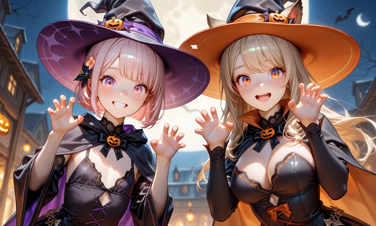 (theme is Halloween night), sfw:1.2. background is Halloween festival, fantasy, fine detail, official art, (background is a large full moon in the night sky), 2girls, Intricate embroidery and decoration, cowboy shot, open mouth, happy smile, gaze at viewer, close-up eyes, face focus, claw pose, low angle, from below, ultra detailed lips, ultra detailed face and hair, ultra detaild eyes, beautiful eyes, kawaii, adorable, cute, they wearing an sheer Halloween themed female witch costume, wizard hat, BREAK, 2girls light pink hair,light pink eyes,loose wavy hairstyle,short bob cut,floral hair accessory,happy smile, (small chest, flat chest), grin, BREAK, 2girls light brown hair, long hair, amber eyes, wild boar's ears, (medium breast), open mouth big smile,, <lora:elf-san_alpha1(AnimagineV31):0.7> <lora:Elf-san_alpha7(IL2.0):0.7>, anime style, anime color,, masterpiece, amazing quality, very aesthetic, high resolution, ultra-detailed, absolute, newest, 2d, semi-realistic, moe heroine, sharp focus,