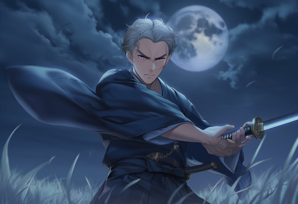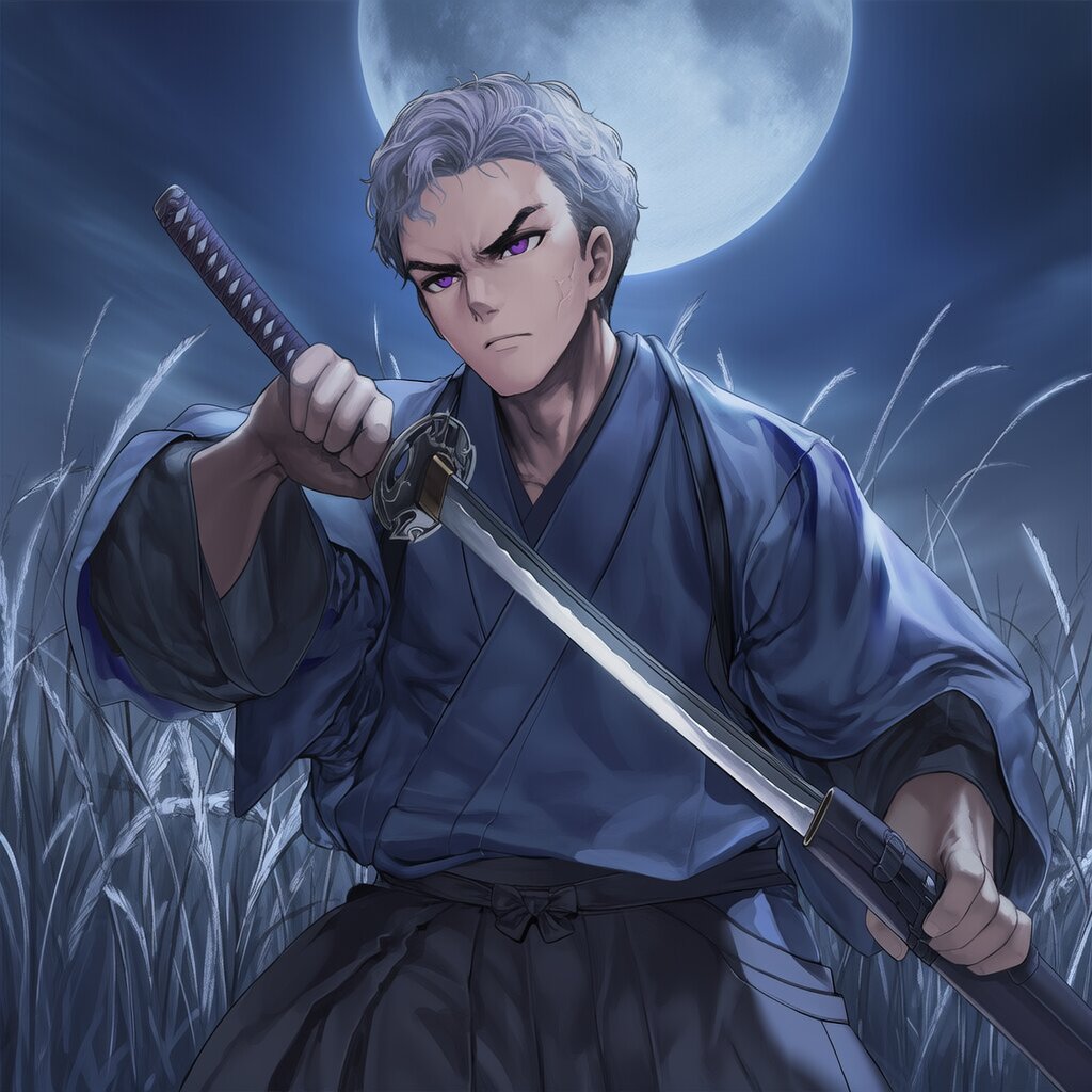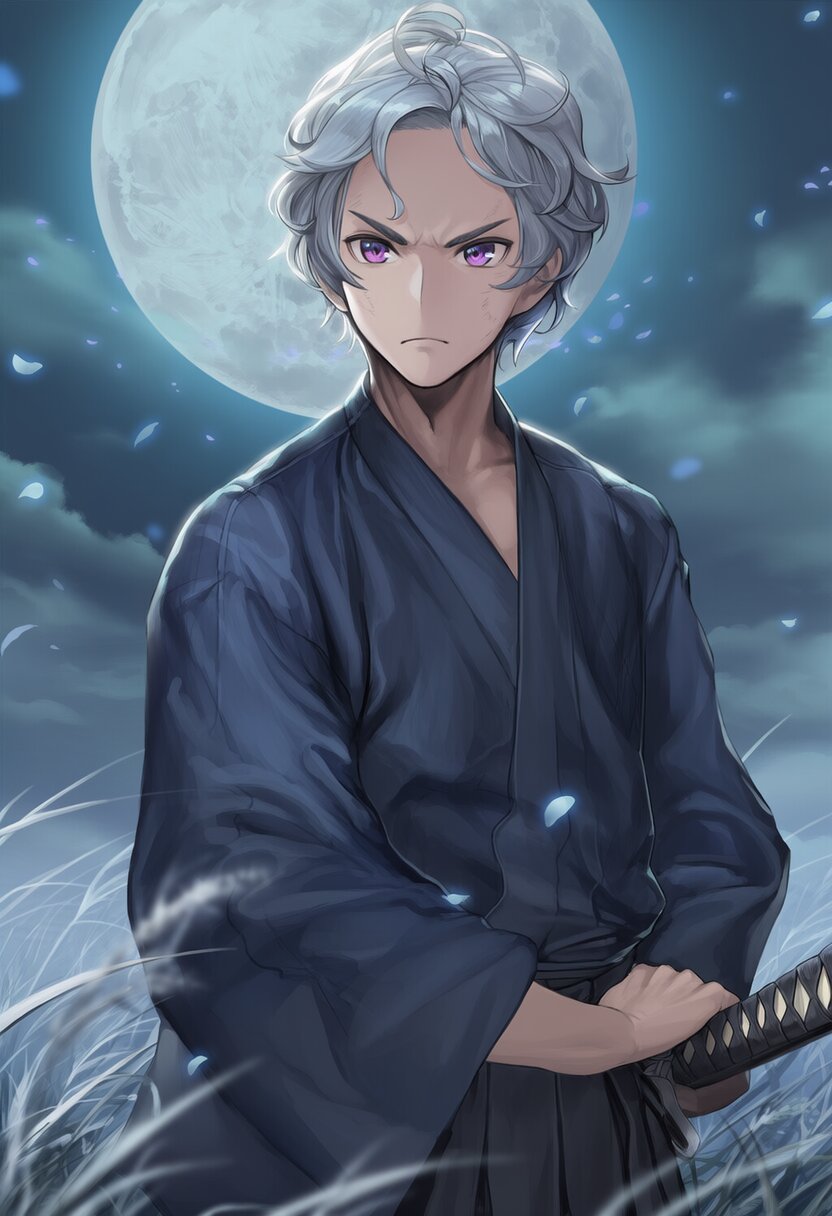 {{{highly detailed}}}, {{official style}}, {{game cg}}, {{intricate}}, {{{male face, male eyebrows, male eyes}}}, {{facial muscle}}, {{bishounen}}, 1boy, solo, {{tenka hyakken, goddess of victory: nikke}}, {{adult male}}, {{25 year old male}}, purple eyes, {wavy hair}, {{{{{{{{{{very short hair}}}}}}}}}}, silver hair, forehead, flat chest, {{serious}}, {{{upper body}}}, {{{dark blue kimono, black hakama}}},, {{{battle, holding a katana}}}, night, full moon, silver grass, no humans, no animal, {{{masterpiece}}}, {{{best quality}}}, {{{very aesthetic}}}, {{{ultra-detailed}}}, {illustration}, {{{extremely detailed}}}, {{{an extremely delicate and beautiful}}}