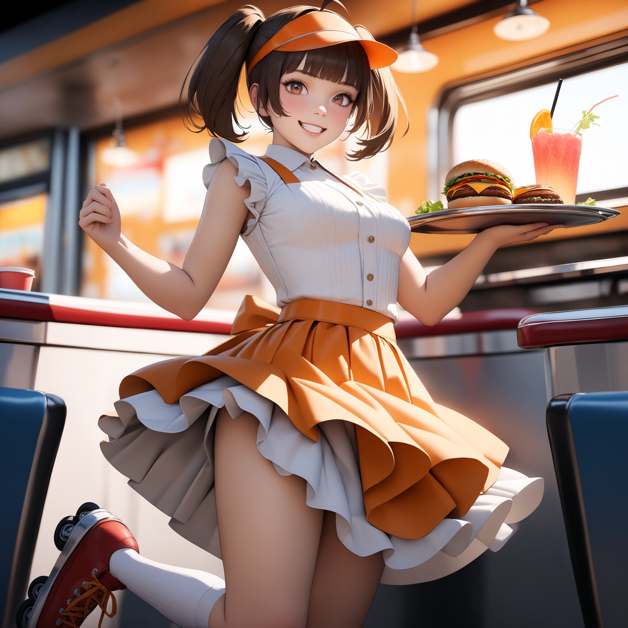 1girl,solo,brown hair,ahoge,blunt bangs,short hair,hime cut,brown eyes,delicate face,detailed face,detailed skin,masterpiece,best quality,insanely detailed,beautiful,8k,photorealistic,looking at viewer,American diner interior,midriff peek,ruffle skirt,pannier,thigh-high socks,white waist apron with frills,high twintails,laughing,holding a tray with melon cream soda and hamburgers on it,cowboy shot,closeup shot,cinematic lighting,standing on one leg,masterpiece,best quality,insanely detailed,beautiful,8K,cheerful,cheerful grin,looking at viewer,detailed skin,detailed face,american,retro,art academia,realistic photo,dynamic angle,lens flare,shining lights,orange and white vertical striped short sleeve open-necked shirt,orange and white vertical striped long flared skirt,white roller skates with orange tires,(orange sun visor:1.2)