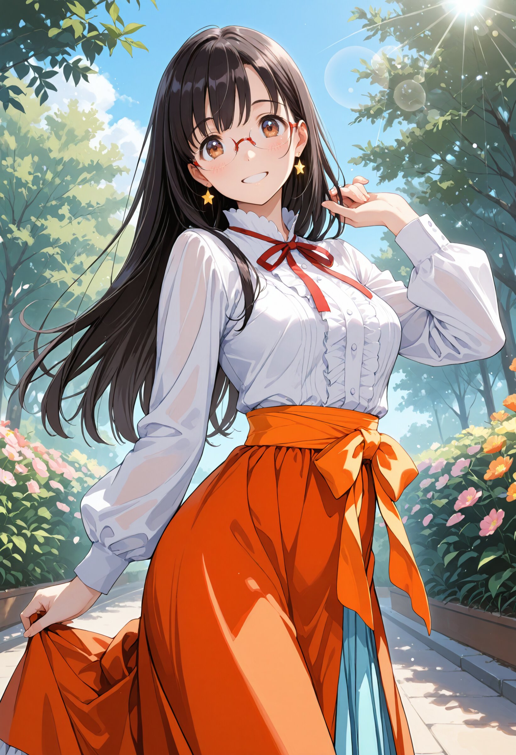 1girl, 17 years old, 155cm tall, brown eyes are shining and cute, black hair, long hair, extremely detailed neat hair,Straight hair, tareme, ((red semi-rimless eyewear:1.2)), star earrings, medium breasts, smile, blushful, happy, compassion, a cute girl in a cream and orange fairy tale dress, dancing outdoors in a lush garden, long-sleeve blouse with ruffles, asymmetrical layered skirt, wide orange sash at waist, high collar, elegant ribbons, dynamic pose, masterpiece, realistic background, detailed background, anime style, kyoto animation style, lens flare, A detailed anime character drawing with smooth outlines, expressive eyes, finely rendered hair, and balanced color tones. from below, cowboy shot,