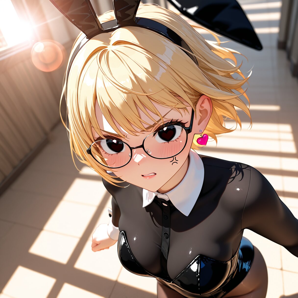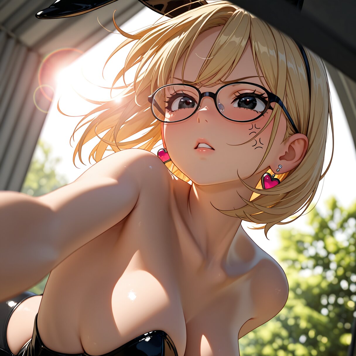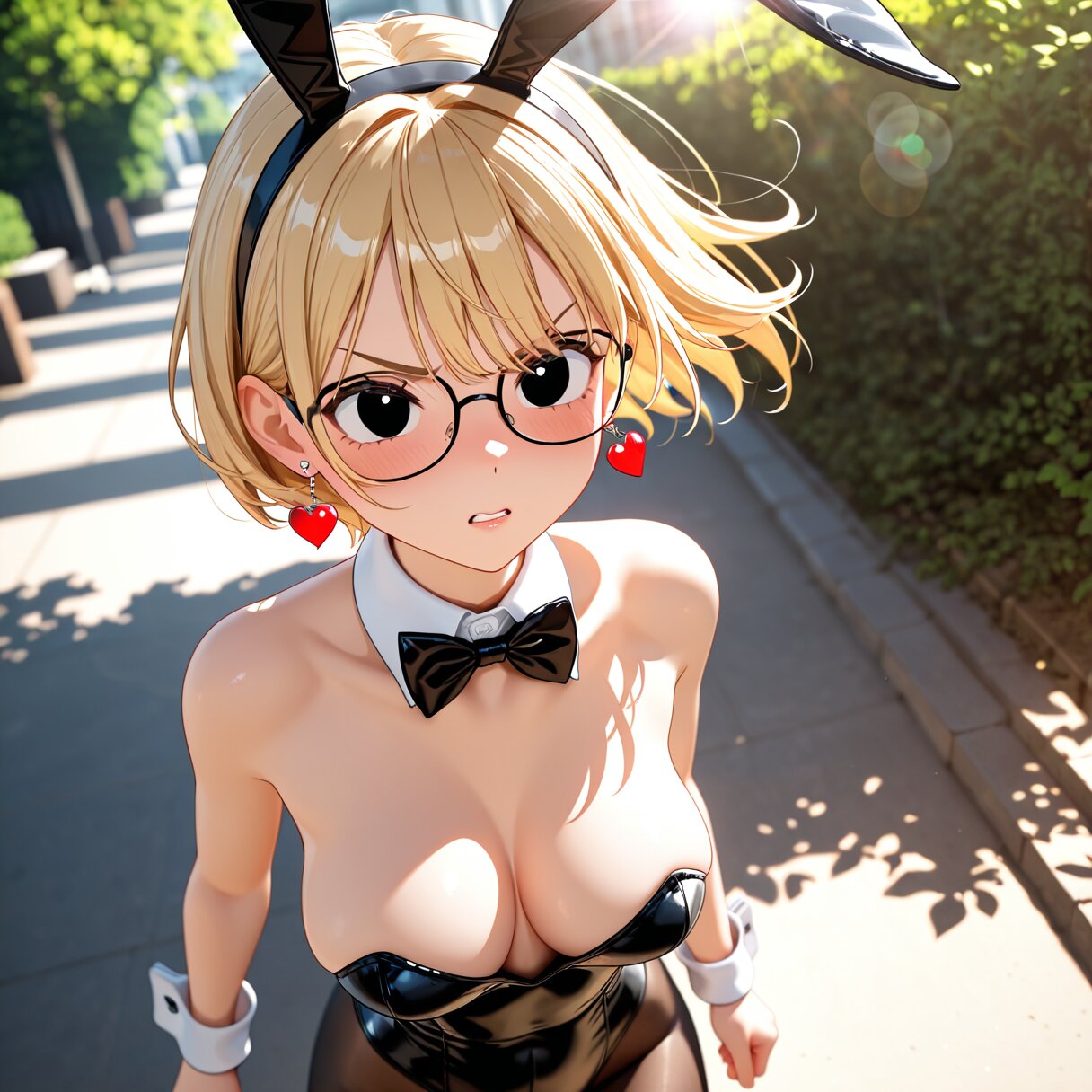 masterpiece, best quality, amazing quality, 4k, very aesthetic, high resolution, ultra-detailed, absurdres, newest, scenery, 3d, rendered, glasses 1girl, blonde hair, short hair, choppy bangs, angry, anger vein, parted lips, bunny girl, full body, heart-shaped earrings, parted lips, black eyes, glassy eyes, medium breasts, portrait, dynamic, modern urban renewal area, soft lighting, floating hair, BREAK, hands, fingers, (dappled sunlight, lens flare:1.2), vignetting, dramatic shadow, cinematic lighting, rim light, detailed background, depth of field, vignetting, volumetric lighting