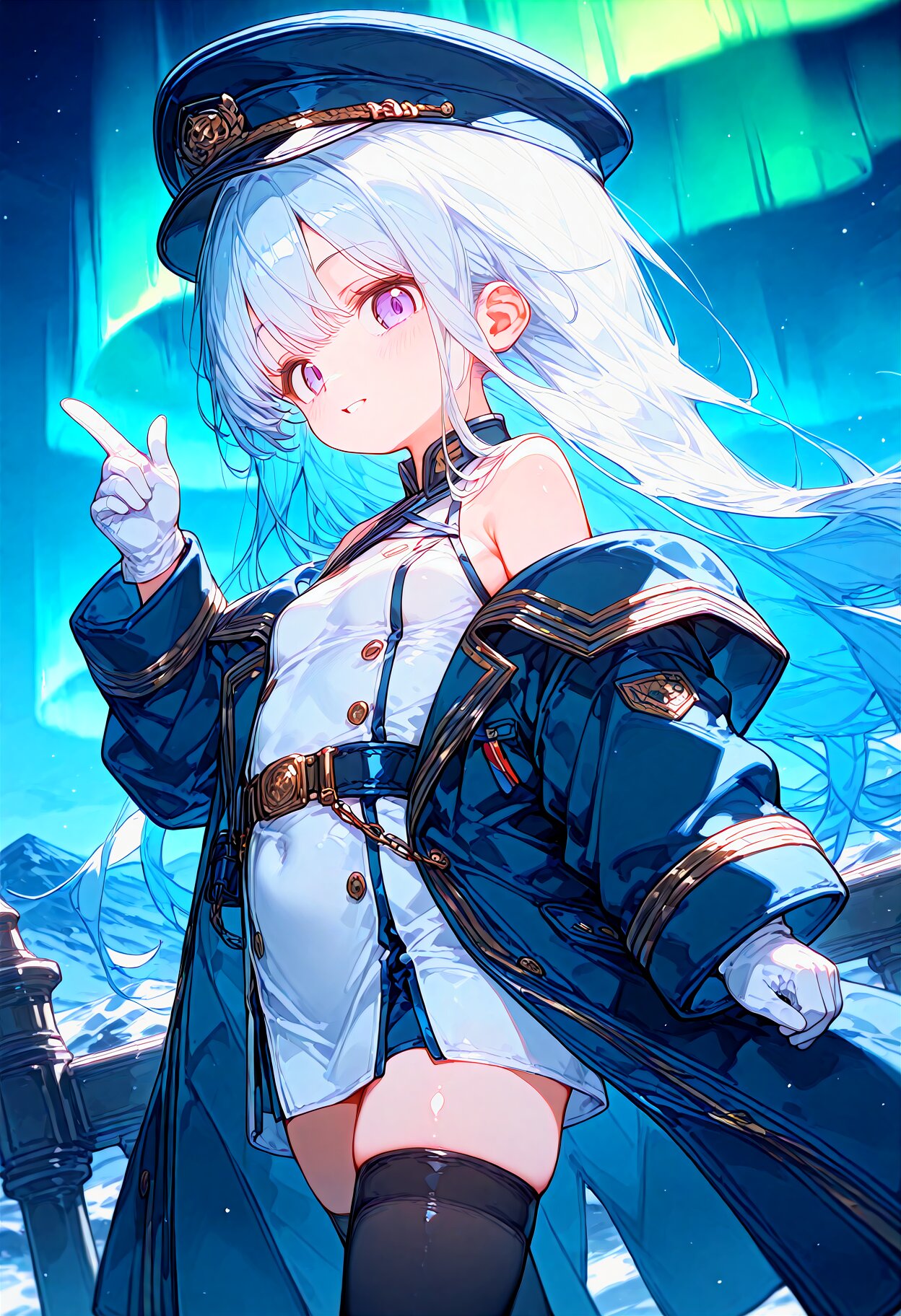 beautiful detailed background, best quality, pale color, (watercolor_\(medium\),:1.2) solo, night sky, aurora, parted lips,Expressionless, big eyes,(half-closed eyes,:1.2) tareme, pale purple eyes, thighhighs, (silver hair:1.1), (dark blue hair colored inner hair:0.8), long hair,very long hair eyebrows visible through hair, military uniform, off shoulder, (blue long coat),(white clothes,:1.2) long sleeves, mini black headwear, chain, chainedkey, white gloves, thighhighs, outstretched arms, (finger gun:1.2),hand up, (crossed legs,:0.7) from side, latex, five fingers, looking at viewer, looking down, <lora:noline-16oa:-2.0> <lora:sdxl2-flat2-512b:-1.2> <lora:LECO_BadHands:-1.5>