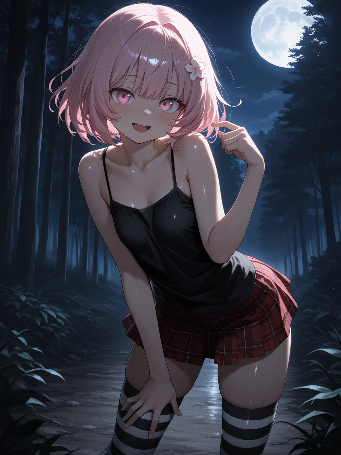 night, light pink hair, light pink eyes, loose wavy hairstyle, short bob cut, floral hair accessory, black camisole, bare arms, red plaid skirt, short skirt, black and white striped thighhighs, night, outdoor, forest, open smile, dark, shiny, glistening, active pose, large moon