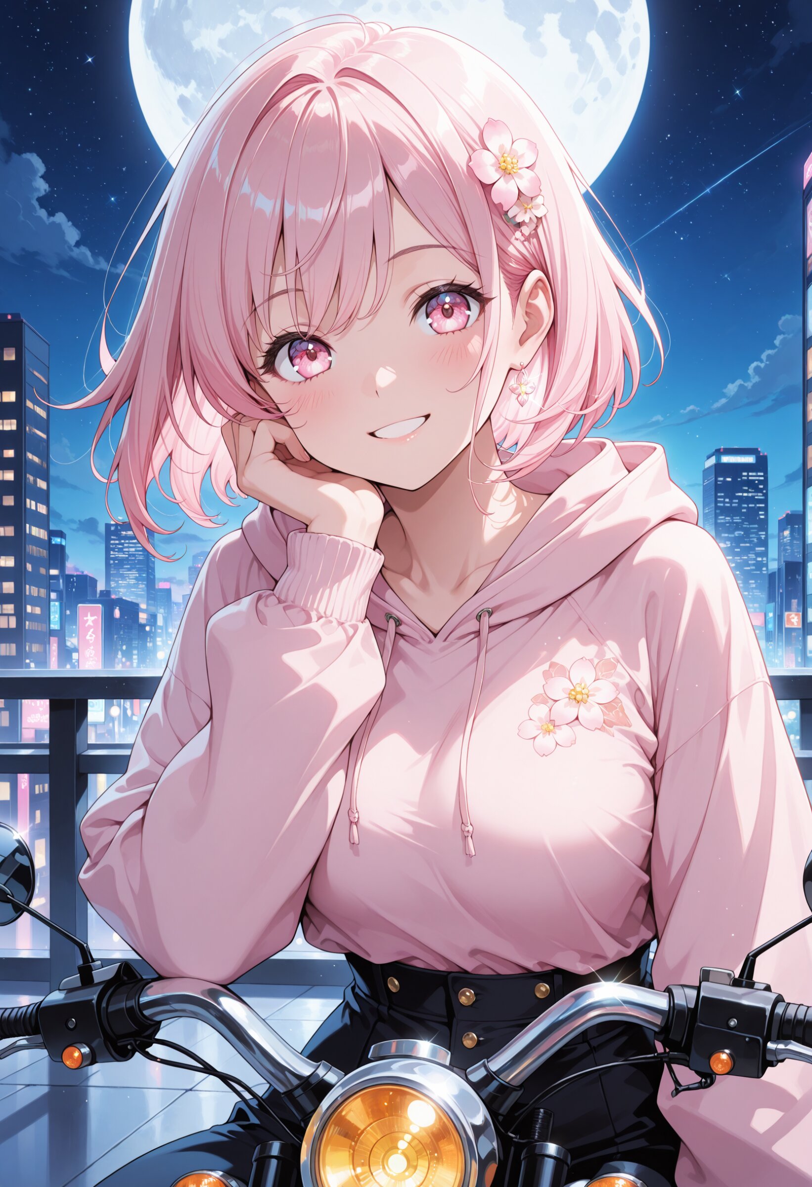 (masterpiece, best quality, ultra-detailed, intricate details, highly detailed face, anime style, 8k illustration), soft pastel and neon color palette, delicate shading, Shojo manga style,dreamy nighttime atmosphere with full moon, 1girl, light pink hair, light pink eyes, loose wavy short bob, floral hair accessory, happy smile, cute adult model, medium breasts, thin waist, lightly glowing hair highlights, gentle moonlight on face, subtle blush, wearing casual stylish outfit (jacket or hoodie with cute details), sitting on or leaning against a sleek retro-style motorcycle, subtle reflections of moonlight on metal, soft glowing neon accents, nighttime city background with gentle lights and starry sky, slightly upper body composition, focus on face, expression, and moonlit glow, soft sparkling light accents