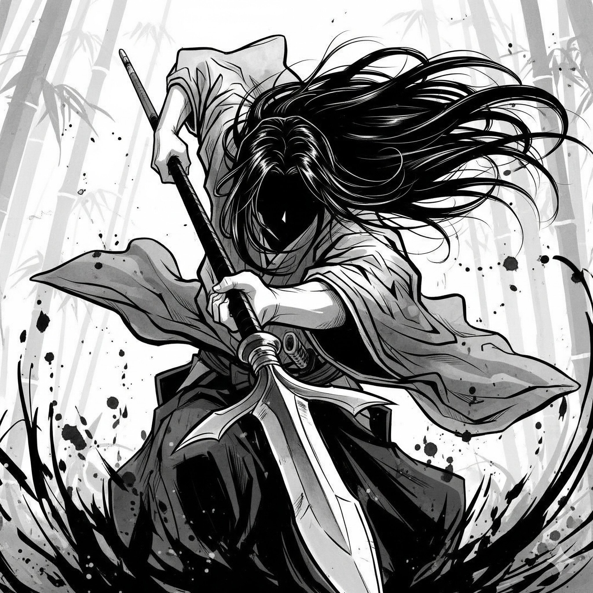 日本の墨絵風、モノクロ高コントラスト。低角度・やや斜め視点で、黒髪ロングの和服キャラクターが屋外で槍をダイナミックに画面へ突き出すシーン。顔は影で隠れ神秘的。腕・肩・腰の動きで槍の振りを強調。着物や髪が風に翻り、動線や墨の濃淡でスピード感と力強さを表現。背景は竹林や神社境内など和風屋外で、光と影のコントラストで奥行きと迫力。墨の飛びや滲みで勢いを演出。