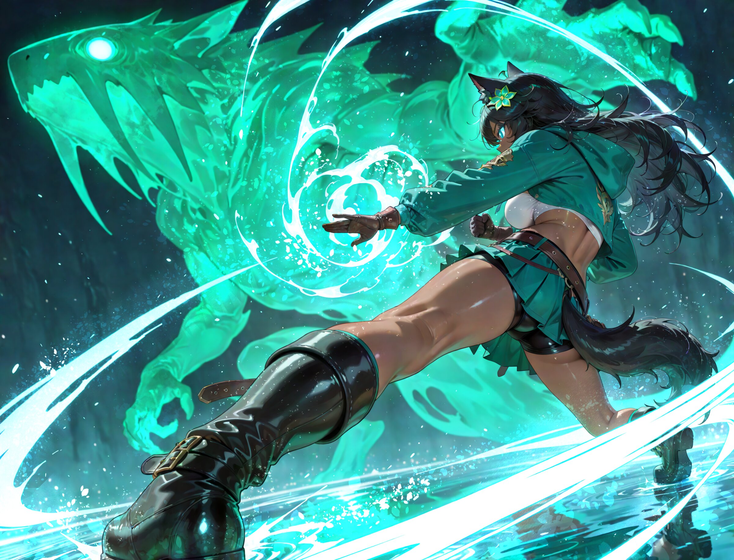 selfie, from side, from below, looking down from side facing away, looking at monster 1girl, black wolf ears, dark skin, young beautiful girl, large breasts, tall, wolf tail, (aristocratic features), (Black Hair:1.2) (disheveled long hair over ears:1.3) messy hair ornament flower, (perfect turquoise eyes:1.3) long eyelashes,, wearing turquoise hood down and white tube top leather gloves, lether miniskirt, belt boots, turquoise hoodie, water magic, , kung fu attack, kung fu pose, kung fu action, (swirling energy,energy magic,energy:1.2), water magic, create water lance, great clear water, reflection, , medieval fantasy world, battle (huge ever green silhouette of kaiju, faceless monster:1.3), (ever green monster:1.2), duel, fighting, danmaku, incoming attack, super fine concept art, hard surface, 8K, unreal engine, masterpiece, best quality, amazing quality, very aesthetic, absurdres you can add scenery, (volumetric lighting), To make the background more distinctive. professional art lots of details, , overexposure, shiny-glistening, (watercolor style:0.5), (pastel color style:1.0) 4ur4_illu,shiny, glowing, glowing particles, glowing light particles, light particles, , <lora:noline (1):-0.5> <lora:sdxl2-flat2-512b:0.0> <lora:facelightup_xl_v10:0.5> <lora:V2_yakumo_alchemy:0.5> <lora:Aura_illu:0.1>
