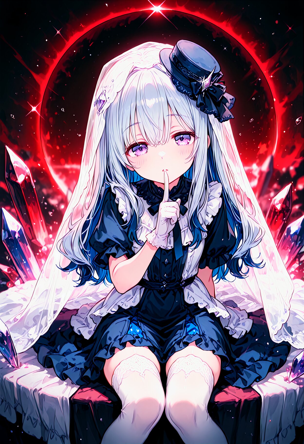 beautiful detailed background, best quality, (pale color:0.9), (dark theme:0.6),(pale red theme:0.7),gradation, feet out of frame, depth of field, ( lunar eclipse:1.3),,(red eclipse,:0.7) parted lips,(Expressionless:0.8), big eyes,(half-closed eyes:0.8), tareme, pale purple eyes, (silver hair:1.1), (dark blue hair colored inner hair:0.8), long hair, eyebrows visible through hair, see-through veil, (one mini hat,:1.2) frills, thighhighs, white gloves, sparkle, (crystal,:1.1) round lighting, white and (darkblue:1.2) two-tone dress, see-through, shushing , sitting, looking at viewer, <lora:noline-16oa:-0.7> <lora:sdxl2-flat2-512b:0.3> <lora:sdxl-shadow_01:-0.7>,