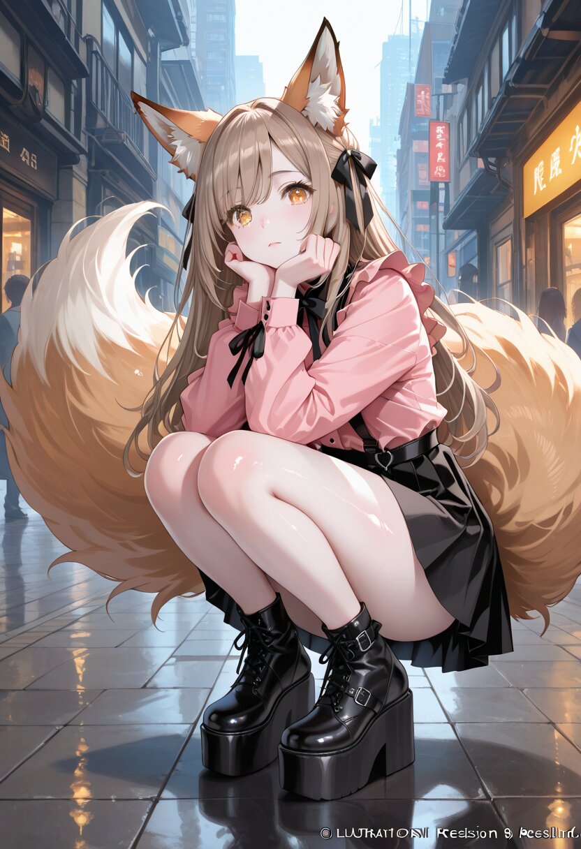 (masterpiece,high resolusion,illustration,ultra detailed 8k art,extremely detailed CG,official art,clothes reflecting light,detailed shiny skin,detailed background:1.3), ((highly detailed beautiful face and eyes),anime style, fox ears girl, light brown hair, long hair, double eyelids, long eyelashes, fluffy tail, jirai-kei fashion, pink shirt, black ribbon, platform shoes, pale skin, melancholic expression, dramatic makeup, soft lighting, urban background, fantasy realism, cinematic composition, ultra-detailed, masterpiece,