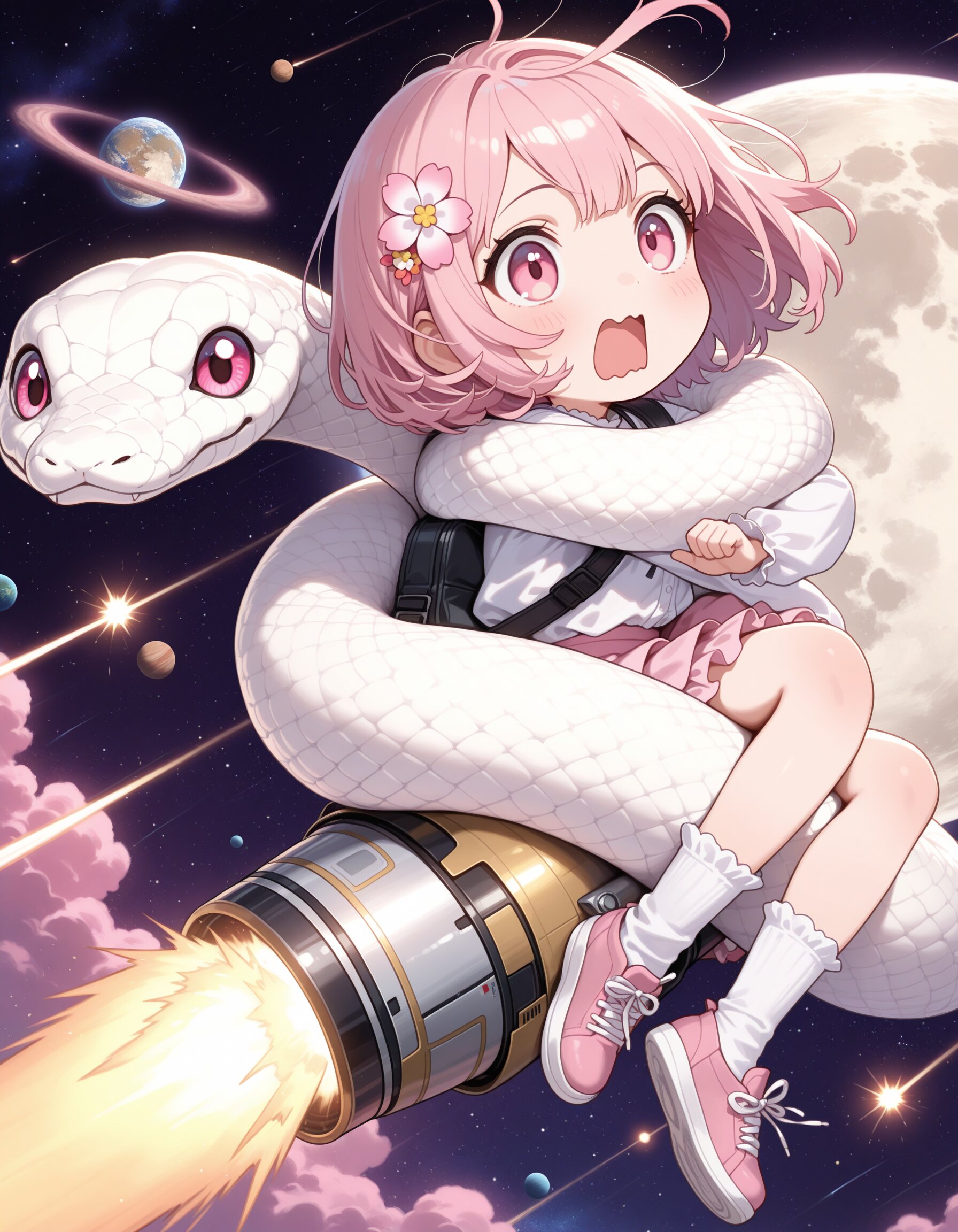 (comical and deformed illustration),in galaxy,planet,big moon,1white snake and 1girl,(chibi),light pink hair,light pink eyes,loose wavy hair,short bob cut hair,floral hair accessory,surprised face,open mouth,wavy mouth,white blouse,frilled skirt,pink skirt,riding on the rocket,boosting rocket,((masterpiece, best quality, extremely detailed, absurdres)),