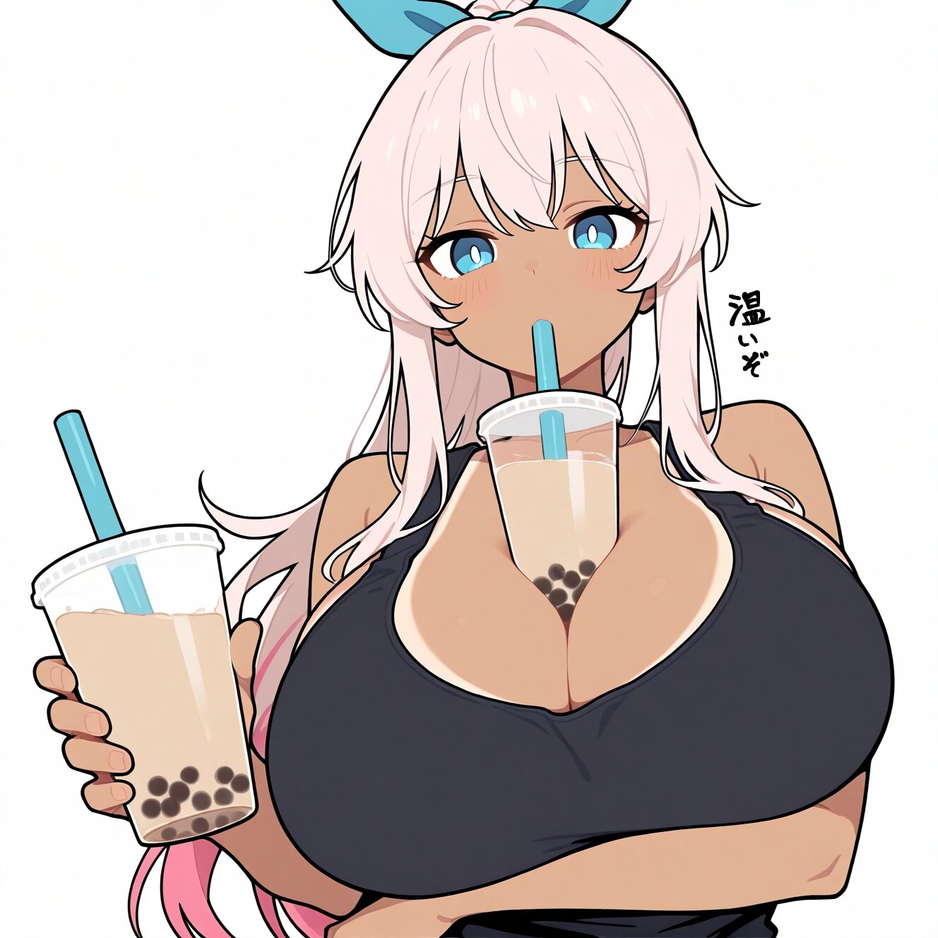 1girl, (dark-skinned:1.2), brown skin, tanned skin, (huge breasts), good shaped breasts, pink hair, well-groomed hair, long hair, multicolored hair, colored tips, (white tips), ponytail, blue eyes, round eyes, bright pupils, expressionless, unemotional, layering, plain color, blue hairribbon, black tanktop, tented tanktop, bubble tea challenge, disposable cup between breasts, drinking straw in mouth, holding disposable cup, holding bubble tea, arm under breasts, giving the bubble tea, incoming drink, condensation disposable cup, foreshortening, perspective, white background, simple background, from front, (shade:1.2), (high contrast:1.3), (stylized), (kawaii), (cute), masterpiece, simple, flat color style, simple coloring style, Bright colors, Contour line, pale painting, ((correct_anatomy)), gddw, (detailed_hands:1.5), flat color style, simple coloring style, highly detailed, ultra-sharp, 8K resolution, flat color style, simple coloring style, gddw, (detailed_hands:1.5), flat color style, simple coloring style, highly detailed, ultra-sharp, 8K resolution