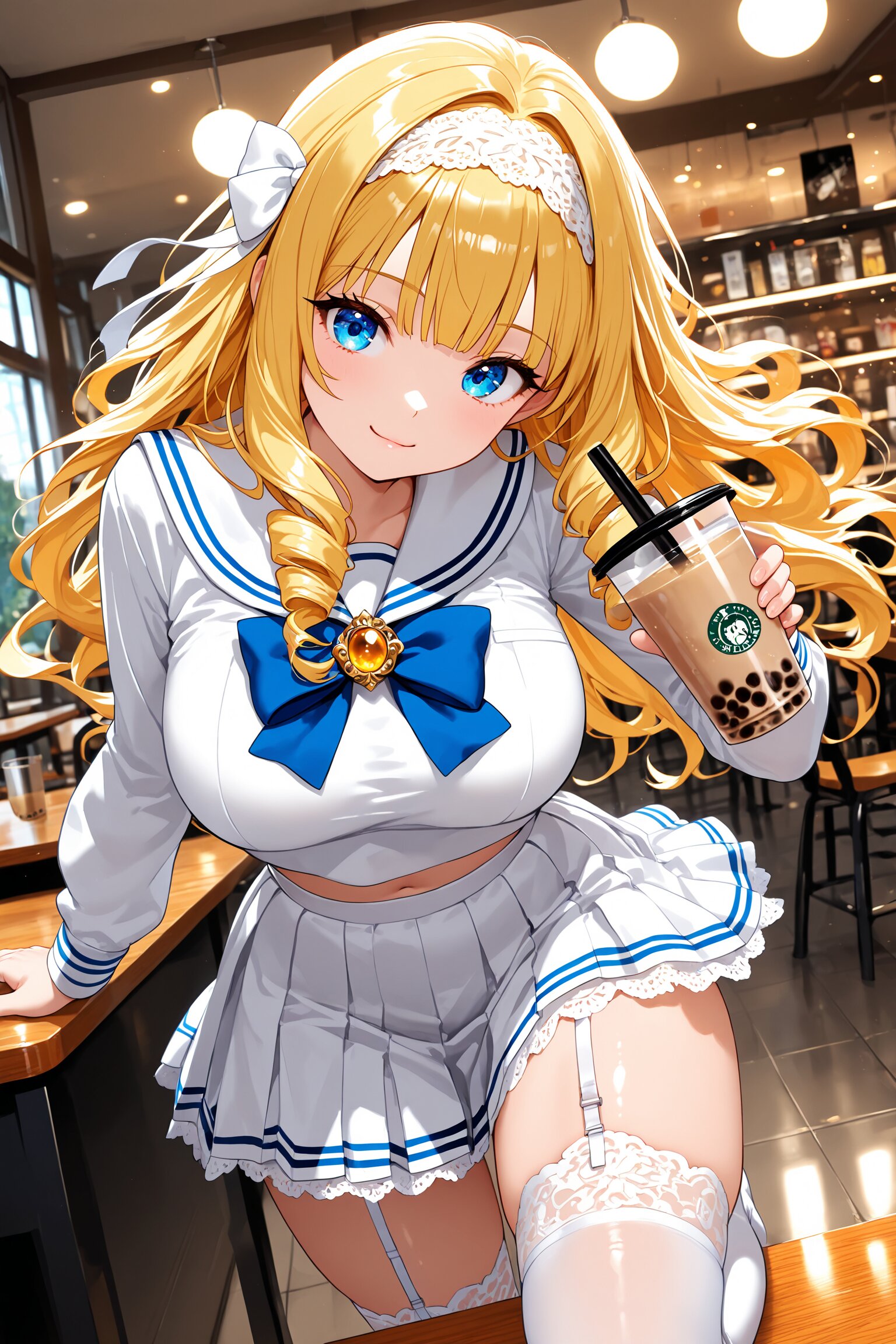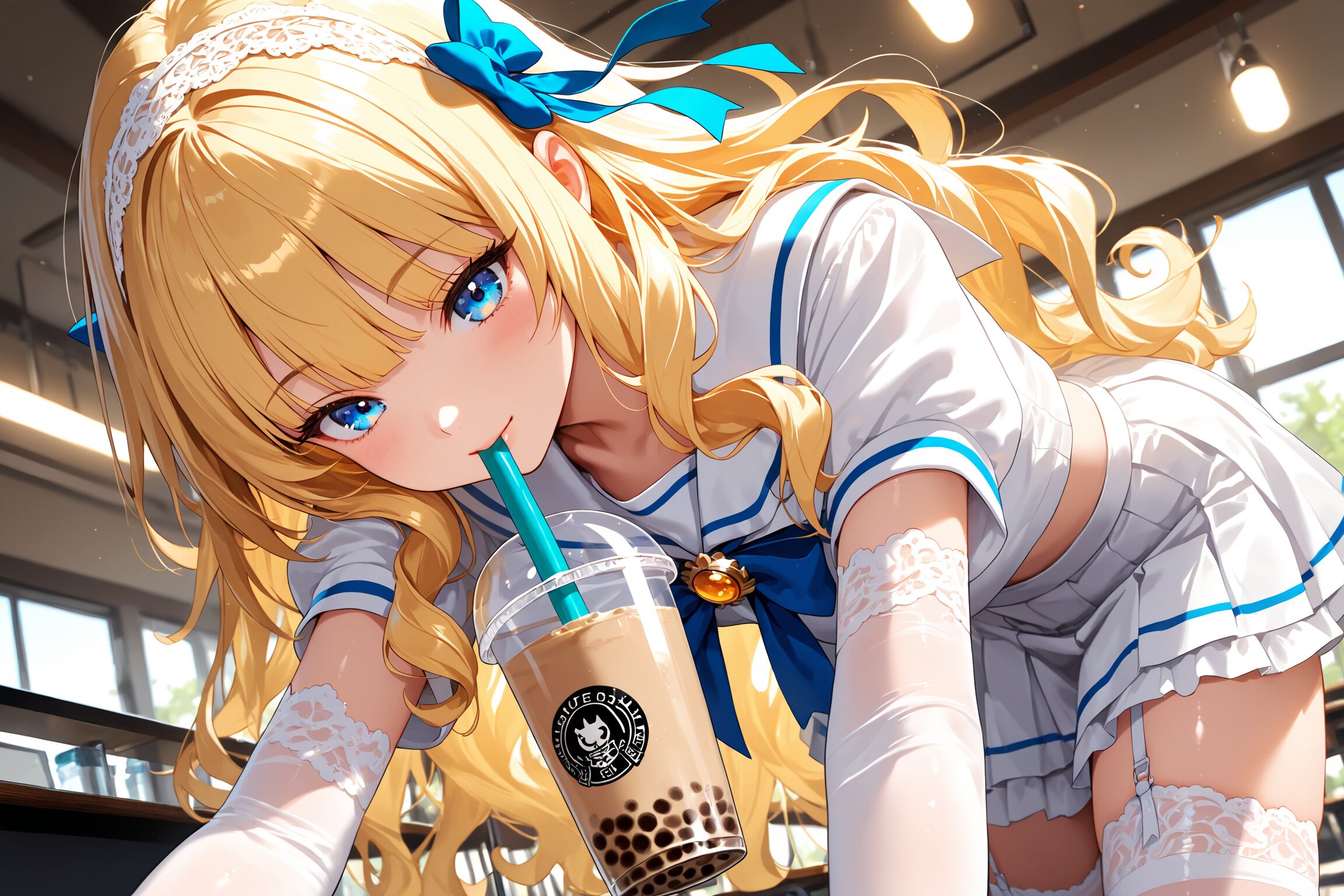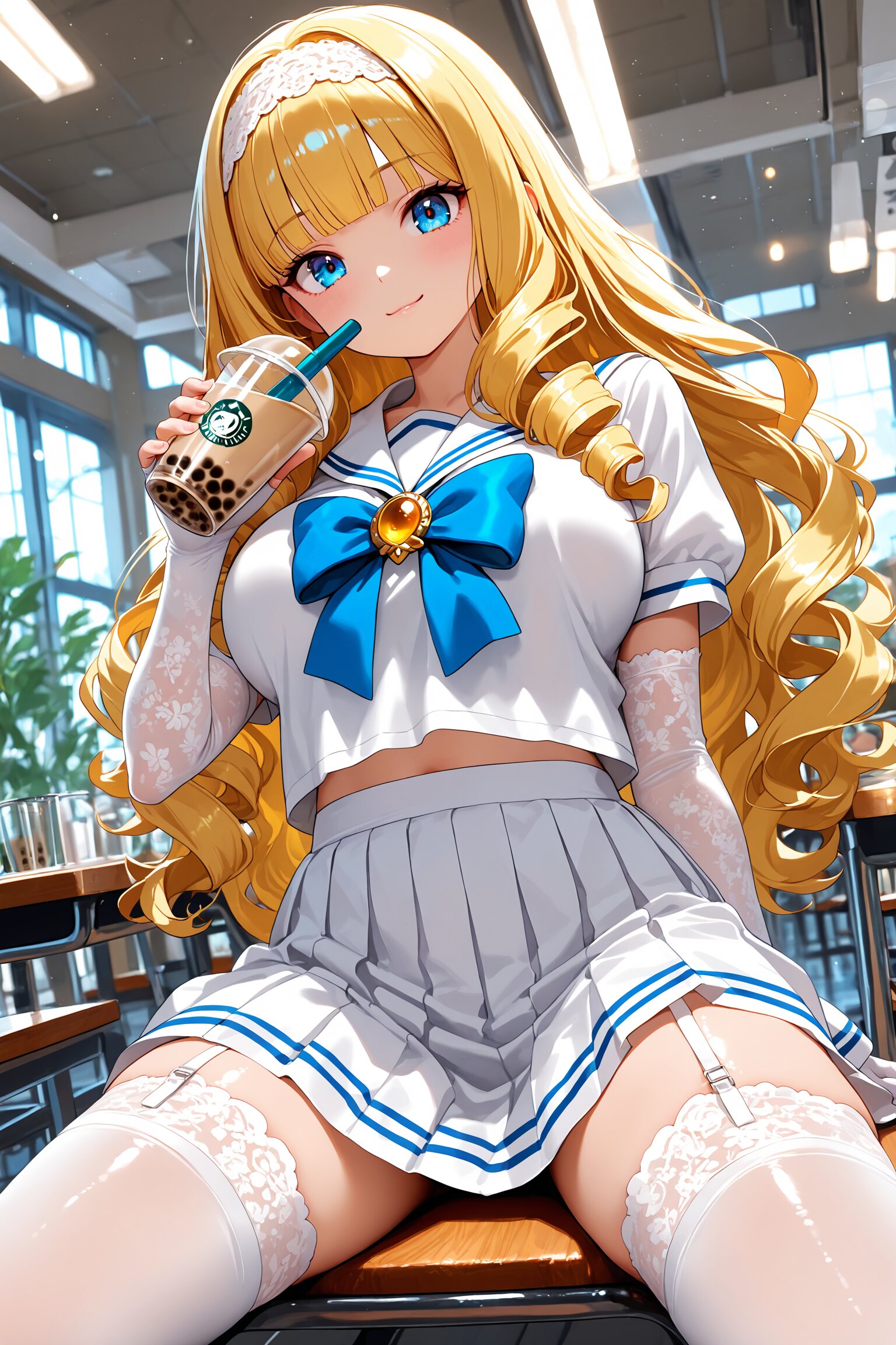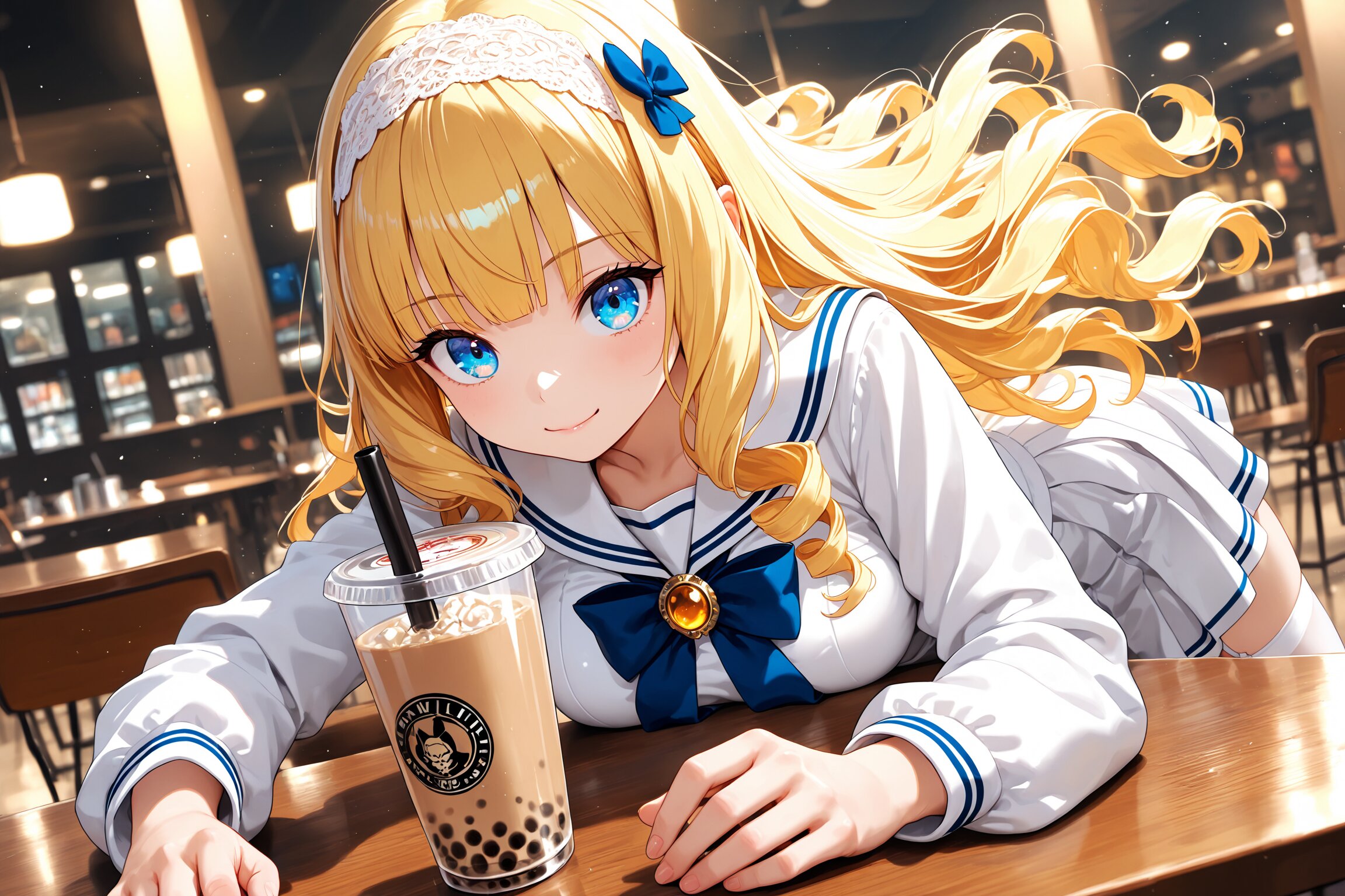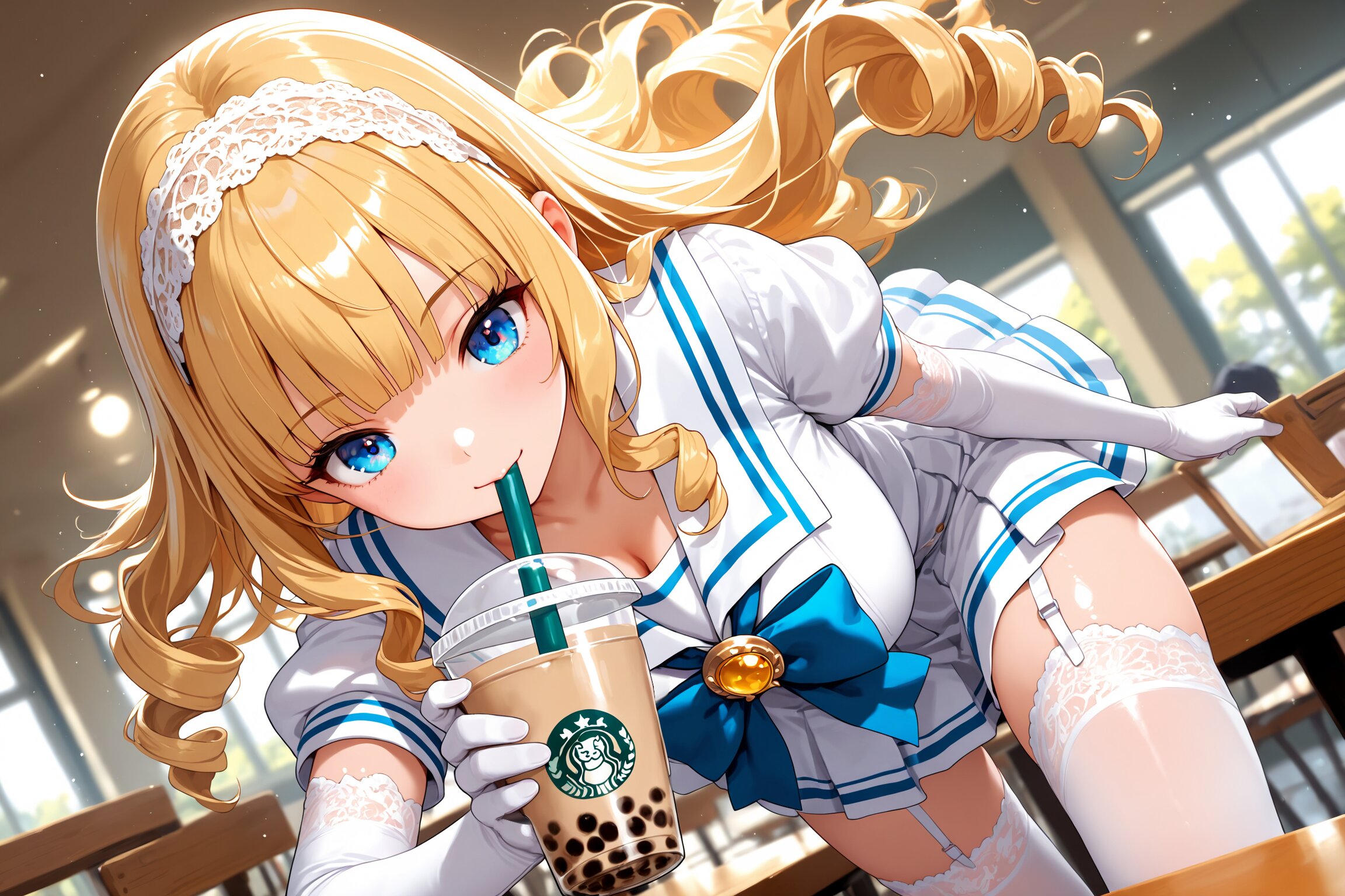 放課後の学園カフェは、文化祭の余韻も残る賑やかさに包まれていた。制服姿の女子たちが集まり、甘い香りの漂うドリンクを片手に談笑している。