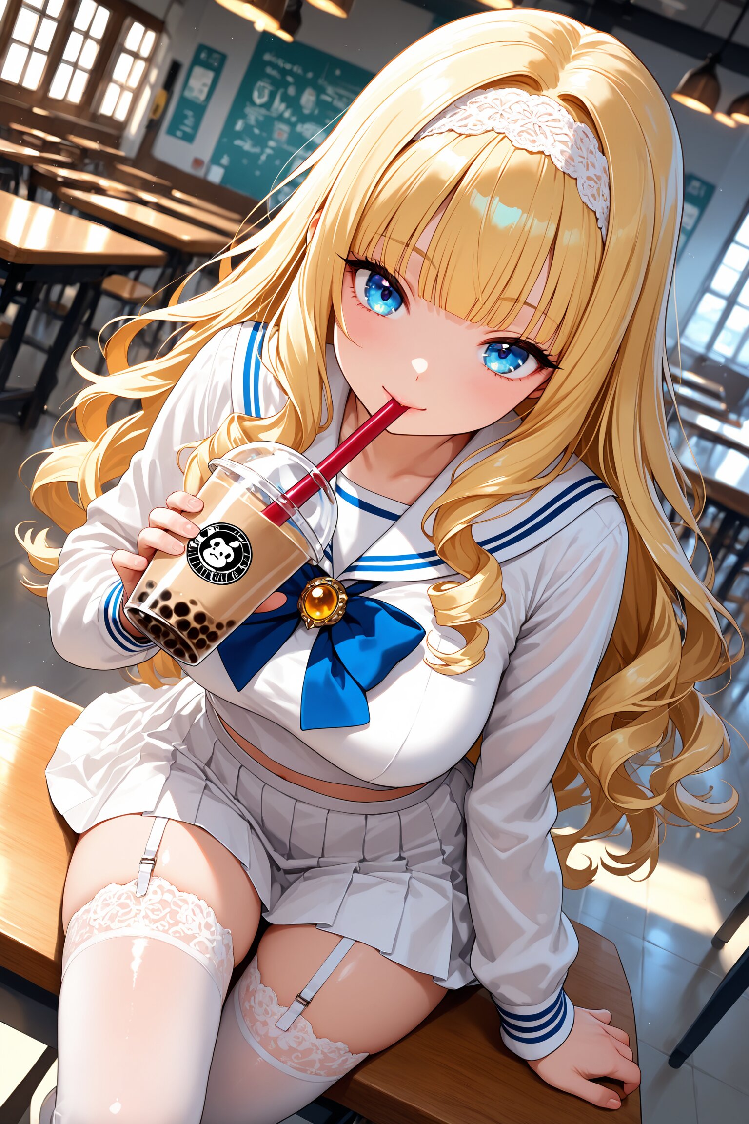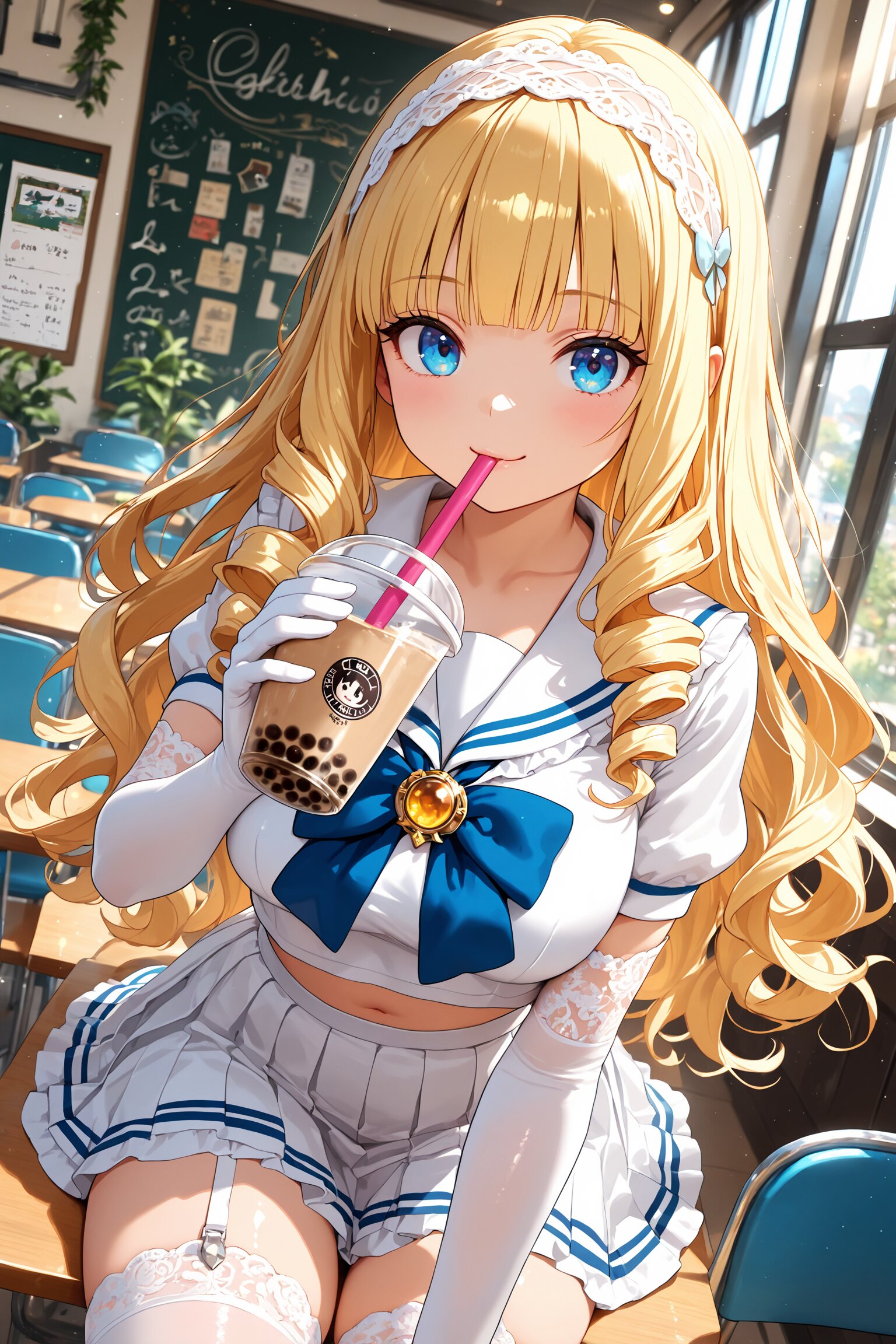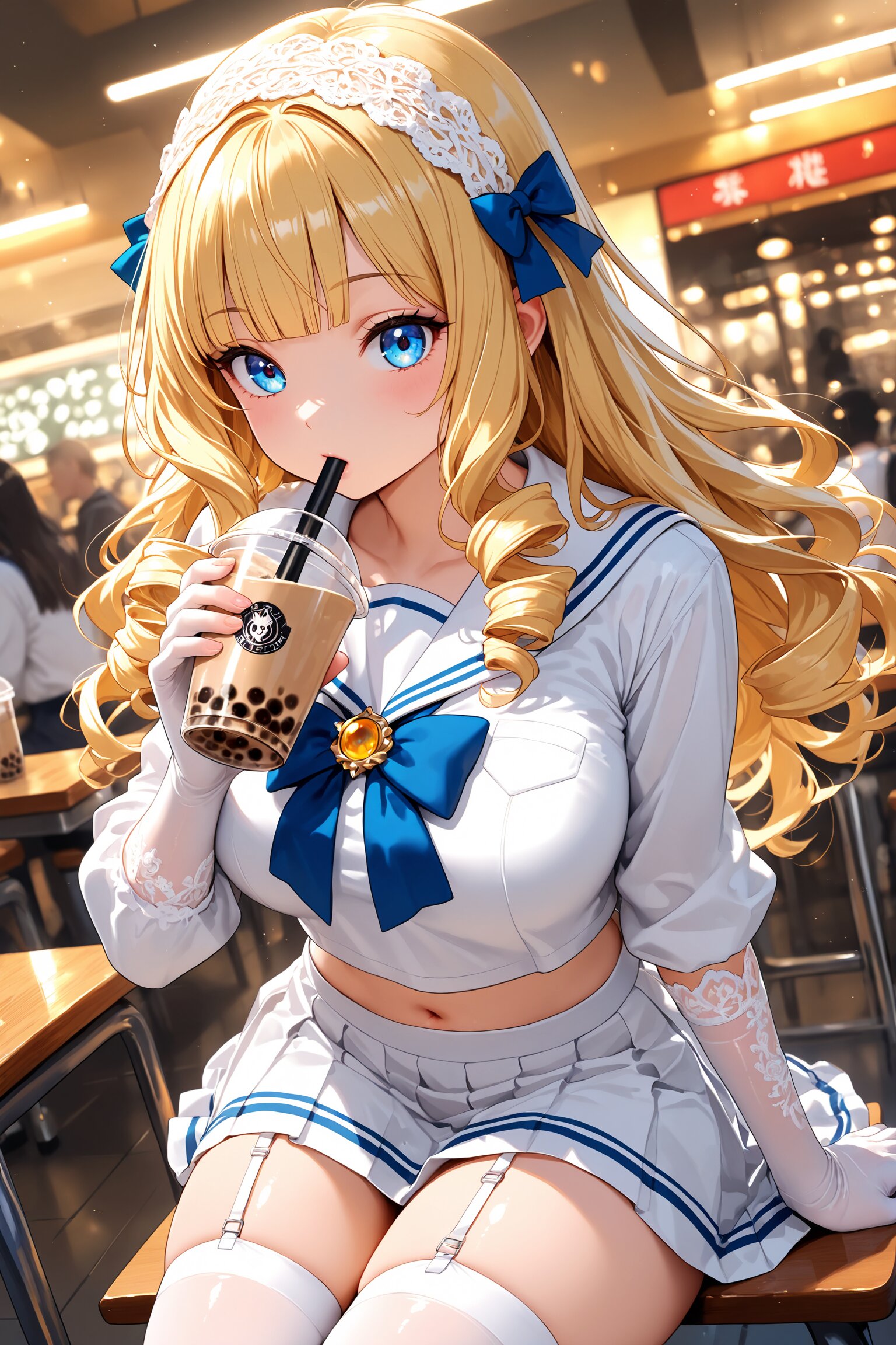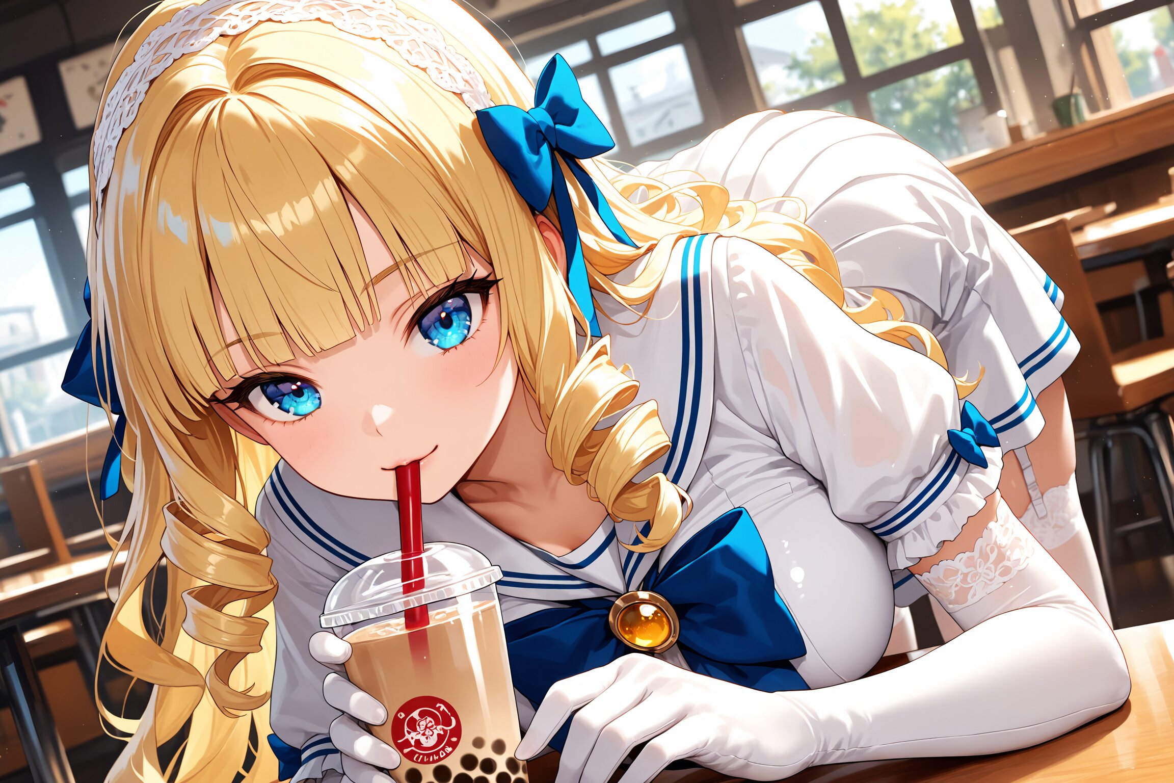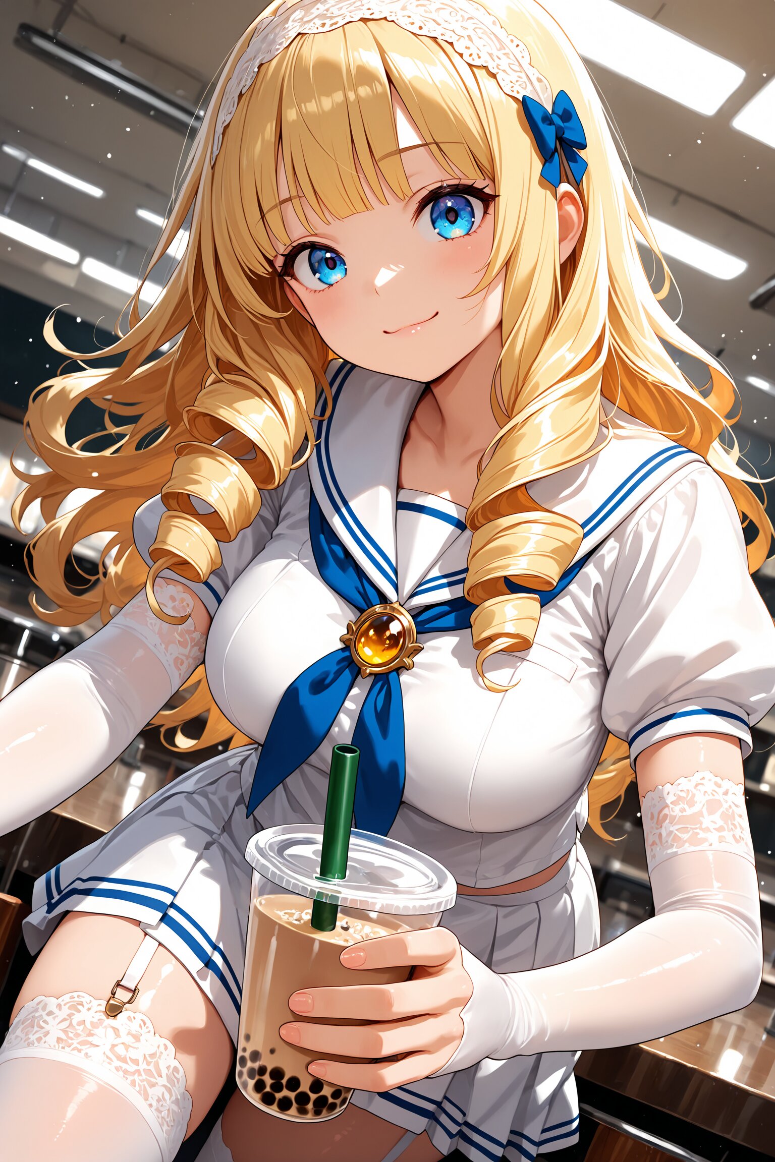 放課後の学園カフェは、文化祭の余韻も残る賑やかさに包まれていた。制服姿の女子たちが集まり、甘い香りの漂うドリンクを片手に談笑している。