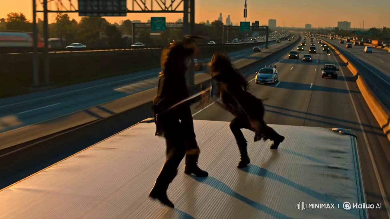 A high-speed action chase on a massive semi-truck trailer barreling down a busy multi-lane highway at 80 mph during dusk: Two agile, beautiful kunoichi (female ninjas) in sleek black shinobi outfits with flowing scarves and intricate shuriken holsters, their long dark hair whipping wildly in the fierce headwind, duel fiercely on the roof of the speeding truck. The trailer races forward relentlessly, weaving through dense traffic with blurred cars and trucks whizzing by on either side, highway signs streaking past, and distant city skyline shifting in the background. One ninja wields dual kunai daggers, the other a gleaming katana, clashing blades with sparks flying, performing acrobatic flips, dodges, and leaps across the trailer’s length as the vehicle vibrates and sways from high-speed maneuvers. One pins the other near the edge, countered by a whirlwind spinning kick that nearly sends them off the side. Camera dynamically tracks the motion with intense shakes from the truck’s rumble, wide panning shots showing the rushing asphalt below and passing vehicles, close-ups of fierce expressions amid sweat and wind-tossed hair, incorporating high-speed motion blur on the surroundings for a sense of blistering velocity. Epic, cinematic style, dramatic orange sunset glow casting elongated shadows across the moving scene, in 4K resolution, fast-paced editing with pulsating electronic orchestral score escalating to an explosive climax.