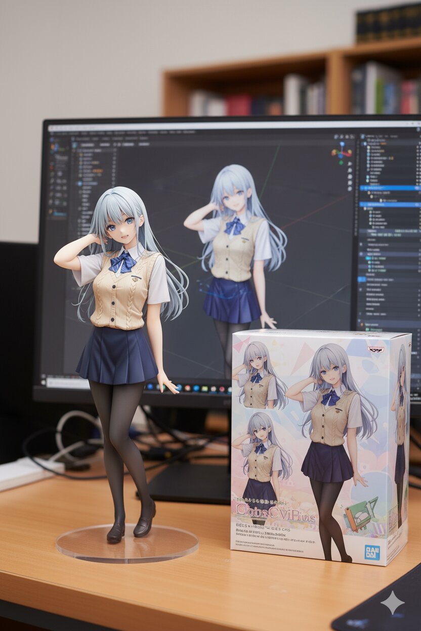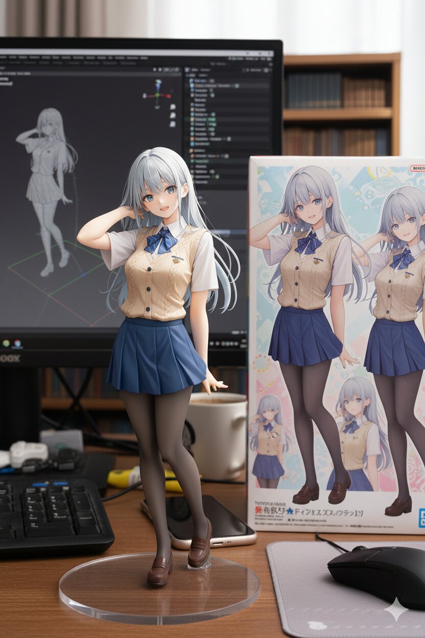 Create a 1/7 scale commercialized figurine of the characters in the picture, in a realistic style, in a real environment. The figurine is placed on a computer desk. The figurine has a round transparent acrylic base, with no text on the base. The content on the computer screen is a 3D modeling process of this figurine. Next to the computer screen is a toy packaging box, designed in a style reminiscent of high-quality collectible figures, printed with original artwork. The packaging features two-dimensional flat illustrations.