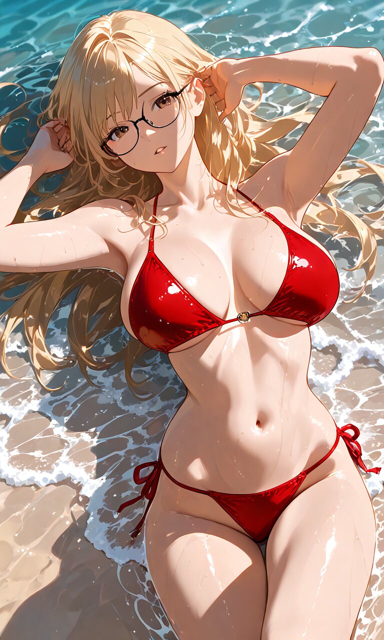 1 lady, long hair, blonde hair, glasses, , red bikini, big breasts,from above, ((lying on water))