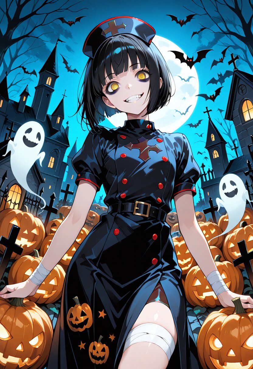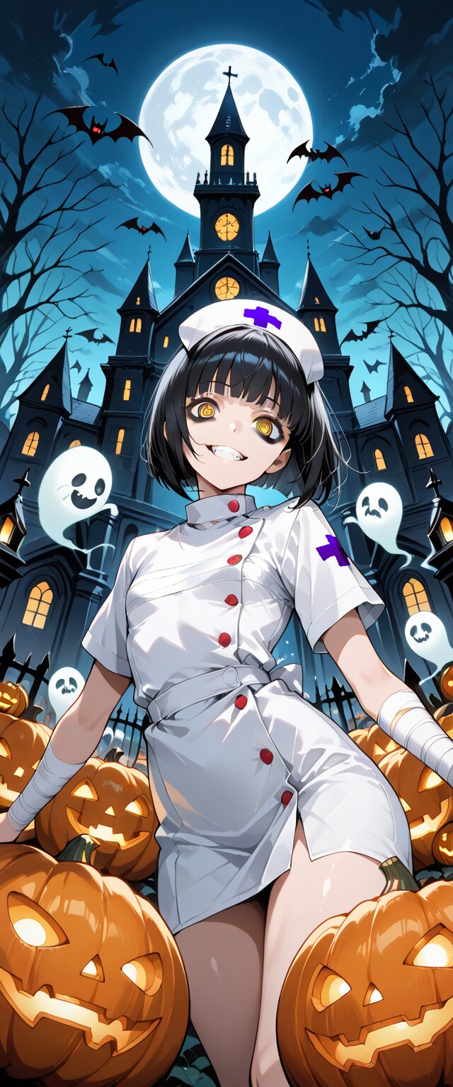 (rating: sensitive:1.2), score_9, score_8_up, score_7_up, score_6_up, source_anime, (flat color style illustration, bold colors). 1girl as hurted nurse, mysterious, tilt head, smirk, grin, black hair, square-bob cut hair, messy hair. (Crazy Eyes, @_@:1.5, bags under eyes, Crazy Smile), (lots of ghost, bats, vampire), cemetery, foggy, haunted castle, (Halloween pumpkins, black pumpkin, night parade, neon yellow eyes), from below, diagonal view, outdoor, night. (fashion illustration, horror, ultra-intricate detailed), flat design, bold colors, patterned fabric, beautiful composition, in the style of cute anime girl. BREAK insanely beautiful and detailed bandage, extremely shiny hair, beautiful small face, beautiful big round eyes, long eyelashes, double eyelids, smile, kawaii, cute, flat chest, slender, exquisitely delicate pale skin, perfect anatomy, (dynamic angle, dynamic pose), BREAK (DOF), sharp focus on the ghost, emphasizing depth, BREAK (masterpiece, aesthetic quality, 8K, ultra-detailed), perfect design, amazing quality, high quality, absurdres, highres, cinematic lighting,