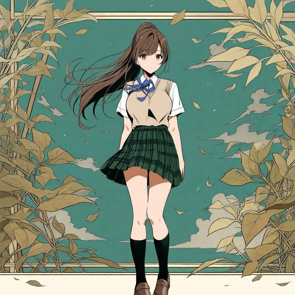 masterpiece, best quality, high quality, highres, 1girl,brown eyes,bangs,ponytail,brown hair,(large breasts), Hair blowing in the wind, beige knit vest, white shirt, short sleeve, blue ribbon tai, plaid pleated skirt, base color: dark green, thick stripes: beige, black socks, brown Loafer, standing,from front,