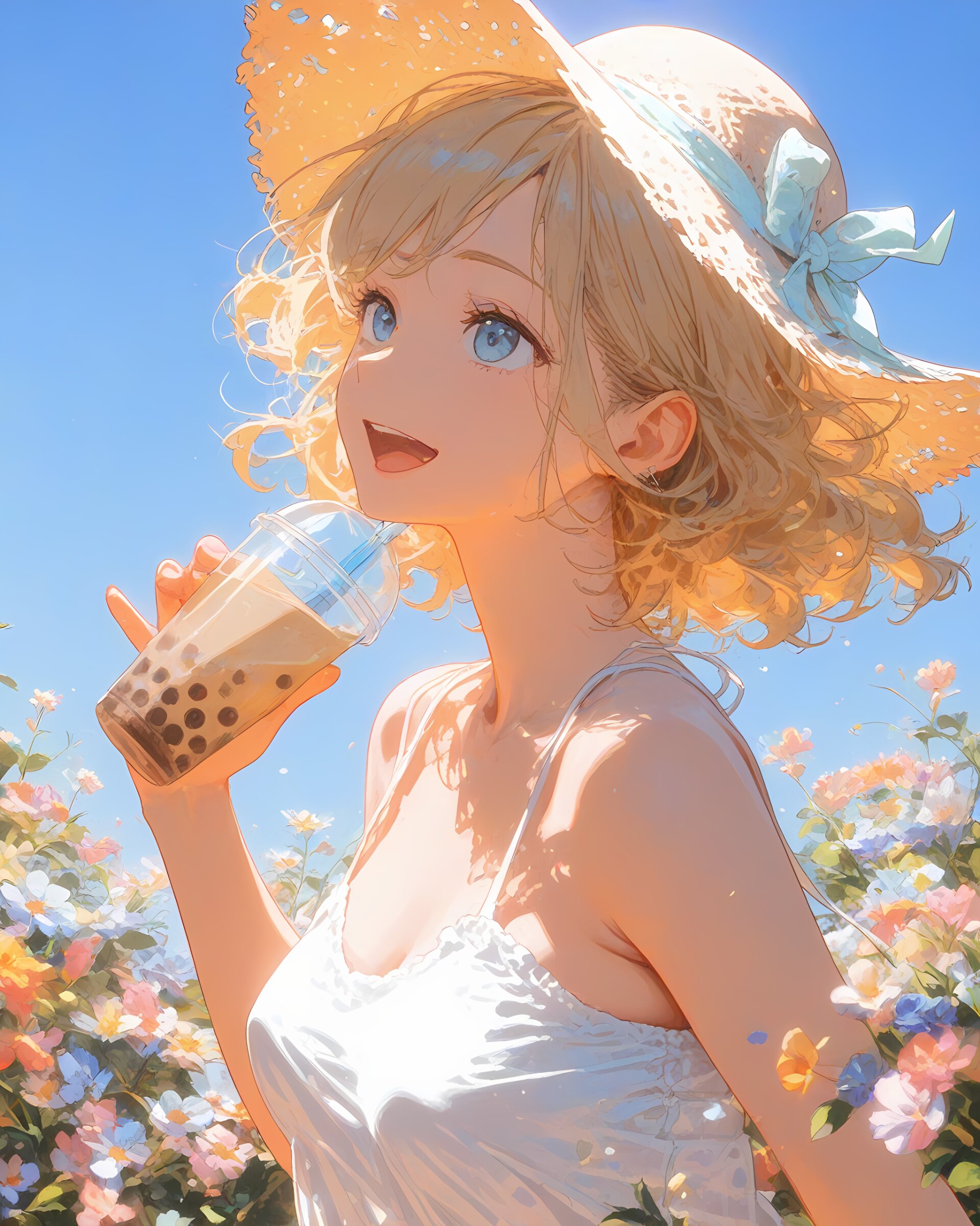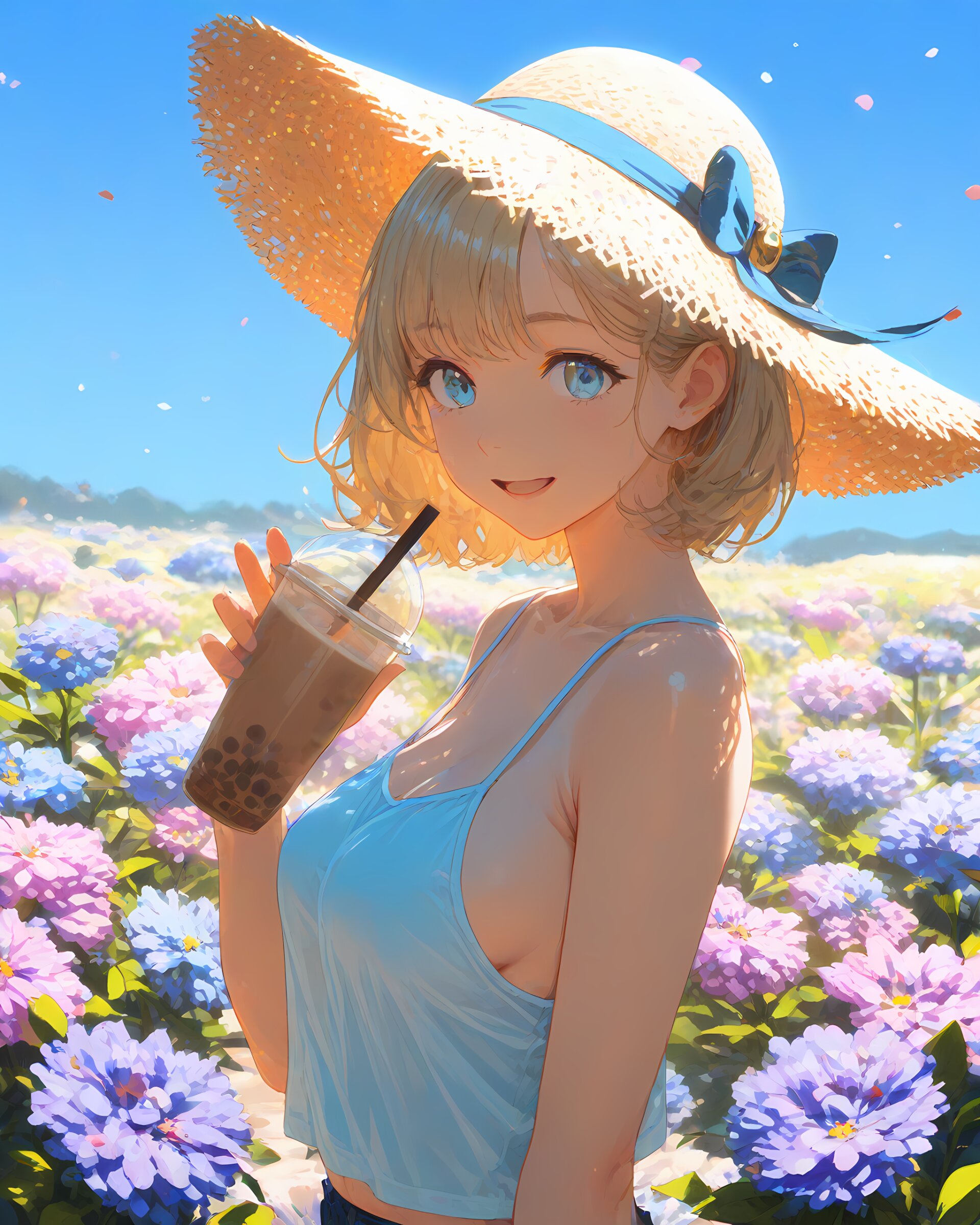 <lora:dmd2_sdxl_4_step_lora_f16:1>,, 1girl, sensitive, drinking bubble milk tea, dynamic pose, blue sky, outdoors, surrounded by vibrant many flowers, summer, golden hour lighting, soft focus on background, 18 years old, girl, short hair, wavy blonde hair, swept bangs, medium breasts, slender, frosty blue eyes, tank top, nipple, spaghetti strap, hat, smile, open mouth, masterpiece, high score, amazing quality, absurdres, best quality, very aesthetic, ultra-detailed,