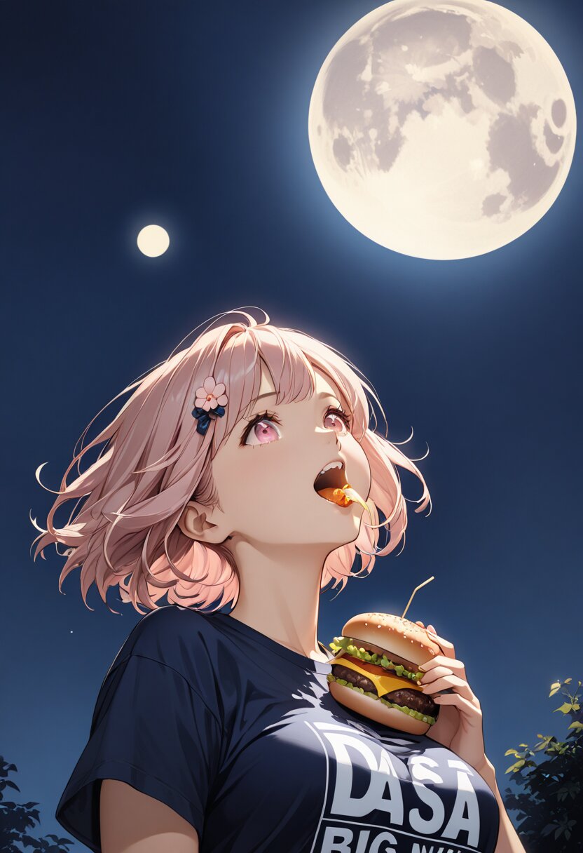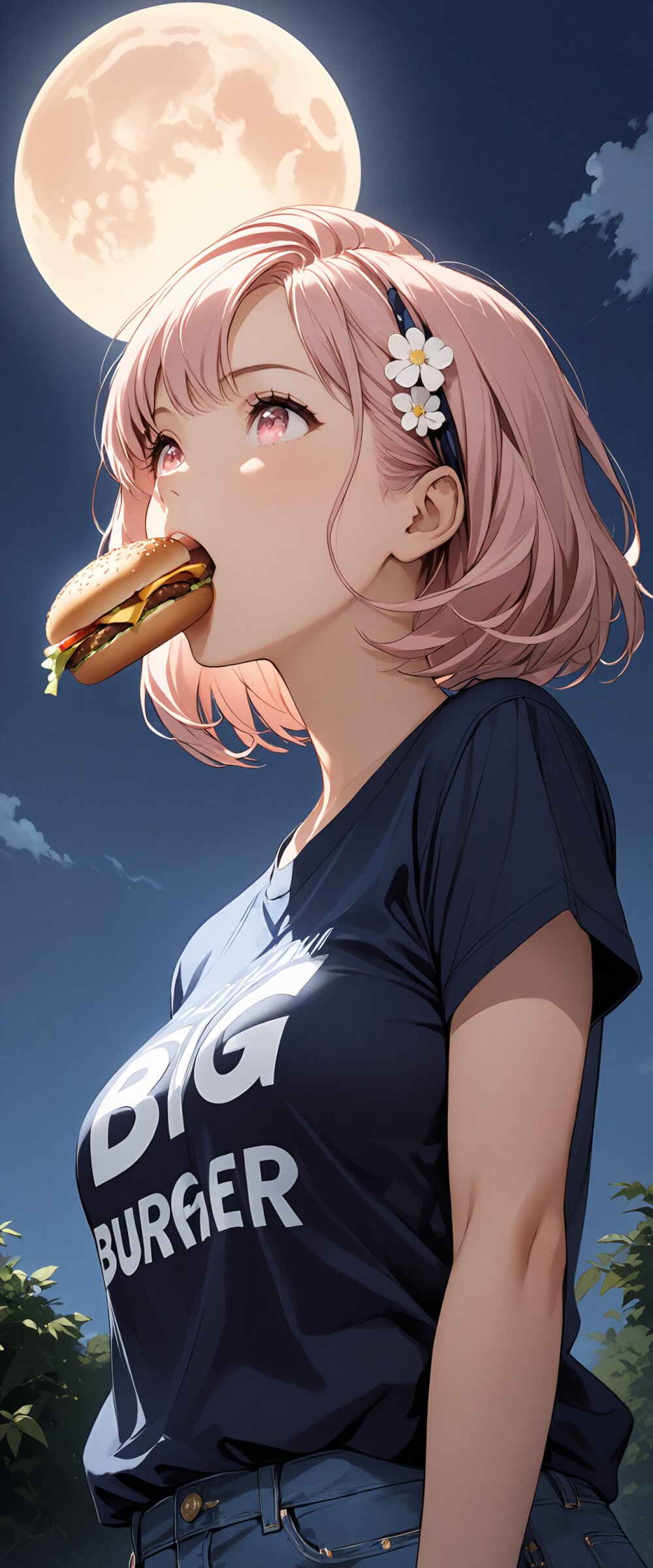 (masterpiece:1.3), (best quality:1.3), (ultra-detailed:1.2), (high resolution illustration:1.2), (low angle shot:1.3), (looking up:1.2), girl with (light pink hair:1.2), (light pink eyes:1.2), (short bob cut:1.1), (loose wavy hairstyle:1.1), (floral hair accessory:1.1), wearing a (normal-sized quirky "dasa-T" t-shirt:1.2) with (big bold black text print "BIG":1.3) across the chest, the shirt slightly shows the natural shape of her chest, (she is happily eating a tsukimi burger:1.2), (background: (huge glowing full moon:1.6), (dark navy blue night sky:1.3), (few subtle stars:0.8)), (the large moon perfectly visible:1.5) behind her, (vertical composition:1.2), (cinematic lighting:1.2), (natural illustration style:1.1)