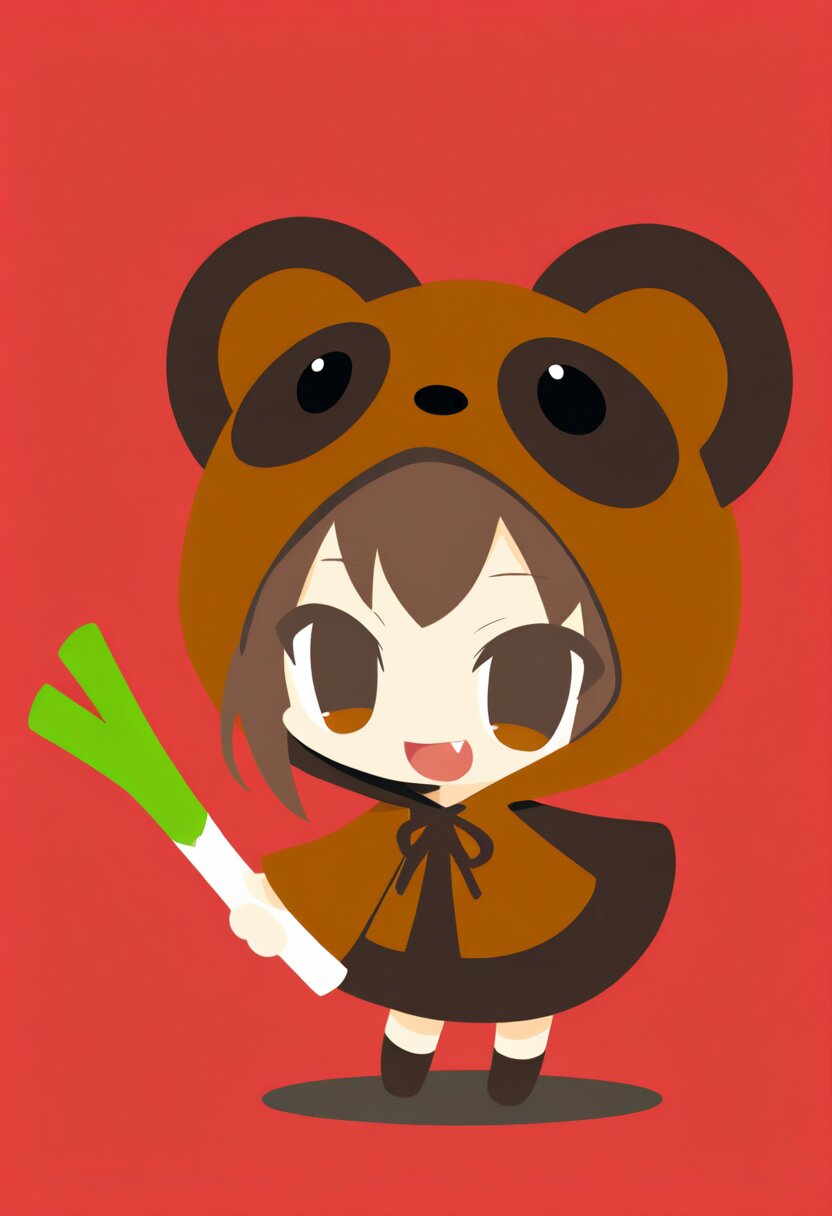 flat color, no lineart, no outline, chibi, extreme chibi, 1girl, solo, 16yo, loli, brown short hair, bangs, smile, fang, red tanuki hood, holding a spring onion, stand, real red background:1.6