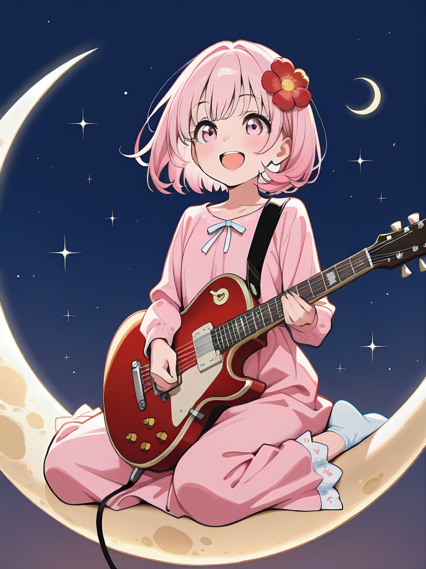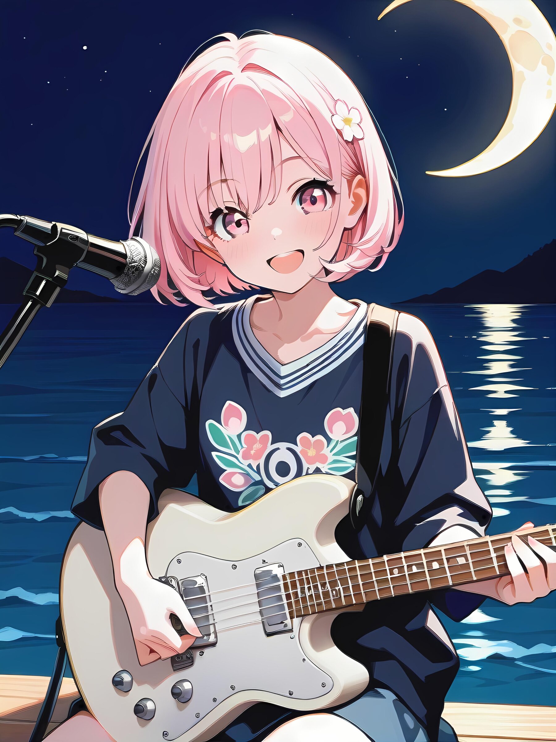 light pink hair,light pink eyes,loose wavy hairstyle,short bob cut,floral hair accessory,happy smile, night Sea, guitar, singing, sit-down on crescent moon, solo,